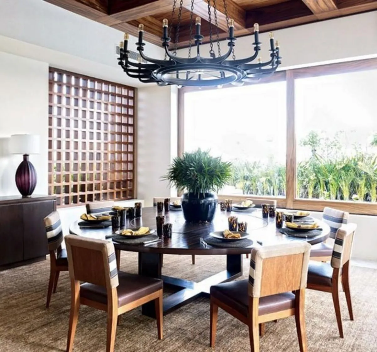 ويستقبل النجم ضيوفه على العشاء في غرفة الطعام المؤلفة من طاولة خشب دائريّة، تؤمّن سهولة التواصل بين الضيوف، وتتدلّى من فوقها ثريا من الحديد، تساهم الشموع في مدّها بأجواء حميميّة.
