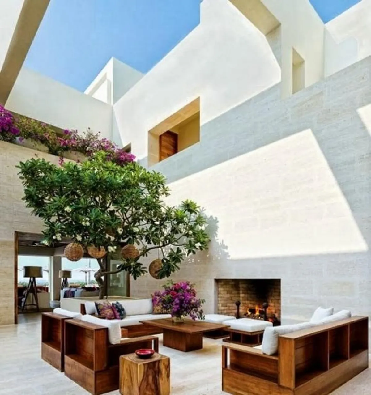 وتضفي شجرة "فرانجيباني" اللمسة الطبيعية عليها، ويتخلّلها الدفء المنبعث من الموقد المثبت في داخل الجدار الحجريّ.