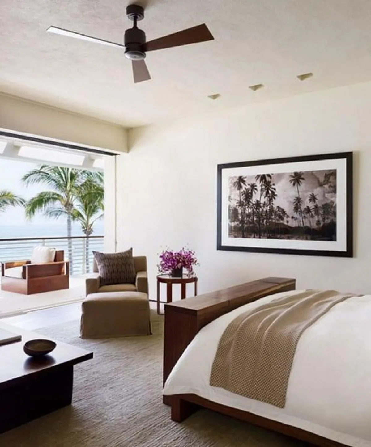 وتضي اللوحة التي تحمل أنامل الفنّان بوين سميث جاذبيةً إلى غرفة نومهما الرئيسية، حيث تبرز الألوان الترابية.