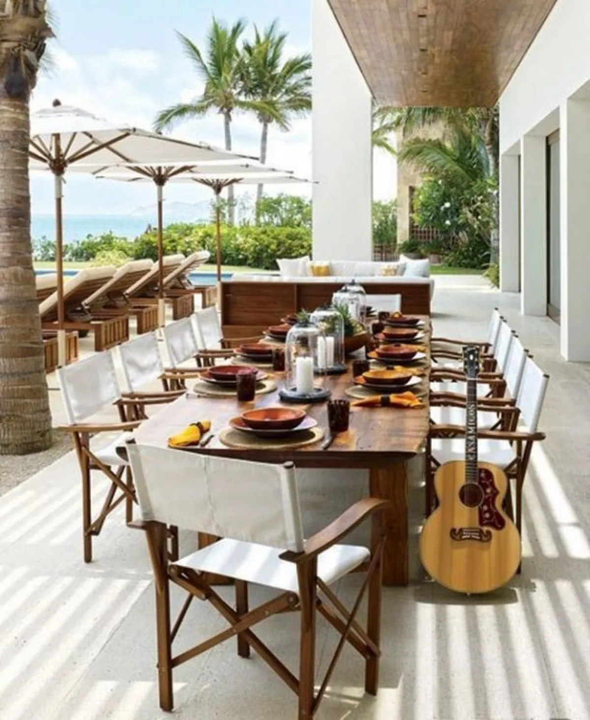 وتحتلّ غرفة الطعام مساحة فسيحة على "الترّاس" الخارجي، حيث يستقبل المالكان ضيوفهما إلى طاولة الخشب المستطيلة، حيث تتلاقى الشموع مع أواني الطعام الأنيقة.