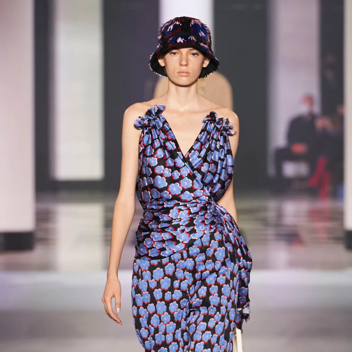 لإطلالة صيفية مُنعشة تناسبك للذهاب للمصايف والشواطئ، اخترنا لك جمبسوت ملونة من علامة lanvin المصممة من قماش الساتان، وجاءت مطبعة بالكامل بورود مختلفة الأحجام باللون الأزرق والأحمر، وصممت بدون أكمام، وتصميم صدر على حرف V من الكشكش مع الأرجل الطويلة الواسعة.