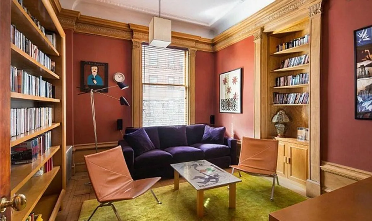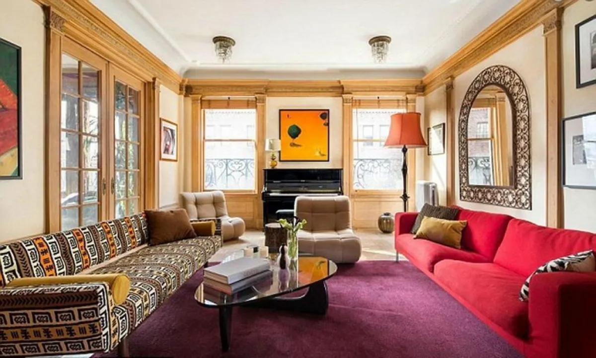 وتضجّ غرفة المعيشة بالألوان الحيوية التي أكسبتها إياها قطعة "الموكيت" المصبوغة بالبنفسجيّ، والتي تفترش الأرض، وتتكئ عليها أريكتان متقابلتان؛ يطغى على الأولى منهما اللون الأحمر، فيما تُزيّن الثانية الألوان الترابية الرائقة.وثمة مرآة محاطة بإطار مشغول من النحاس تعلو إحدى الأريكتين. وفي هذا الغرفة، يتصدّر البيانو الجدار الرئيس، ما بين نافذتين تطلان على المدينة، حيث يمكن مشاهدة أضواء المدينة التي لا تنام!