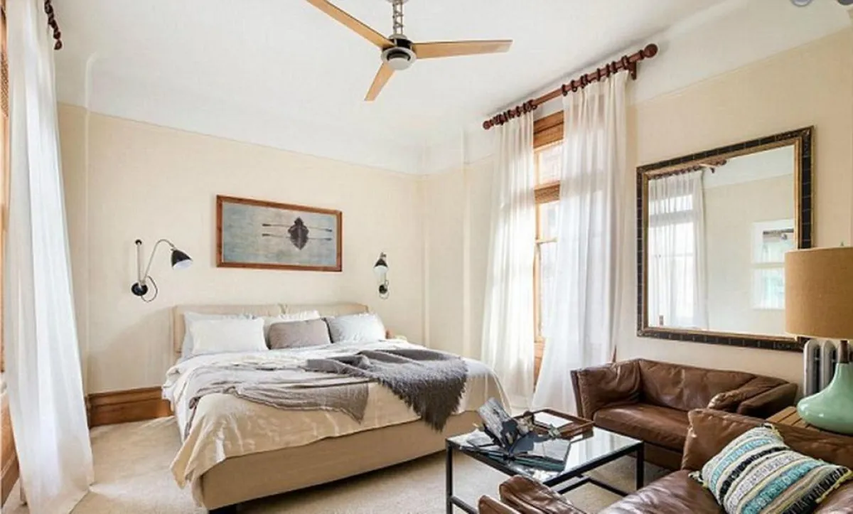 وتحكم البساطة غرفة النوم الرئيسة، إذ يقتصر أثاثها على السرير المزدوج، وعلى جلسة تضمّ مقعدين من الجلد البنيّ، فيما تغطّي الستائر البيضاء الشفافة نافذتيها.