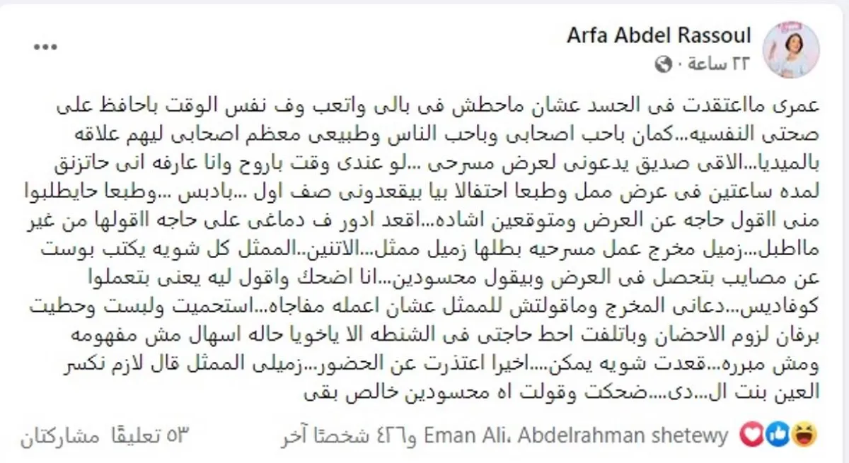وكتبت عارفة عبد الرسول، عبر حسابها الشخصي بموقع الفيس بوك: أنا حزينة وفي شدة الألم.. عارفين البوست اللي كتبته عن المسرحية المحسودة والإسهال ومش عارف إيه.. زملائي زعلوا منه جداً وافتكروا إنّي بيتريق على المسرحية اللي لسه ماشوفتهاش.. أنا آسفة جداً حقكم على راسي من فوق.