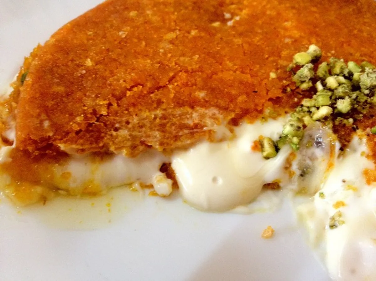 2-إذا لم يتم تقديم الكنافة فوراً وهي ساخنة، من الأفضل تقليبها في صينيّة، سكب القليل من القطر على الفرك وتسخينها في الميكرويف لمدّة 5 دقائق أو حتّى تذوب الجبنة.