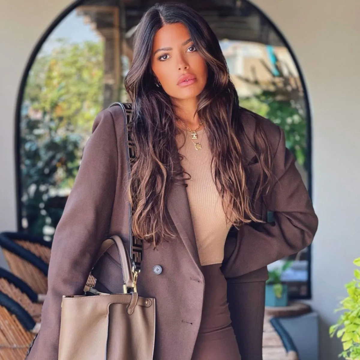 وفي هذه الإطلالة اعتمدت بدلة رسمية راقية؛ حيث صممت من بليزر طويل من القماش باللون البني الداكن صمم بأكمام طويلة وجيوب أمامية مع ياقة طويلة وأزرار كبيرة باللون الأسود ونسقت معه توب باللون الأوف وايت وسروال ضيق بخصر مرتفع، واختارت حقيبة يد كبيرة باللون البيج.