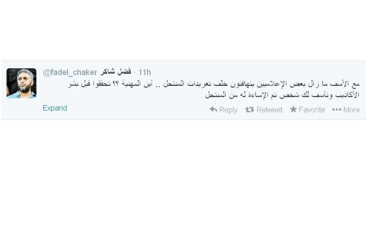 بعد صدور القرار الاتهامي من قبل القاضي العسكري رياض غيدا الذي طلب فيه الإعدام للفنان المعتزل فضل شاكر بتهمة تأليف عصابة إرهابية والمشاركة في قتل جنود من الجيش اللبناني، توجّهت الأنظار إلى حساب فضل على "تويتر"، لمعرفة تعليقه على الحكم وكان الغريب، نشر فضل تغريدة تجاهل فيها حكم الأعدام، مطالباً الصحافيين بعدم أخذ أي تصريحات تصدر على حساب ينتحل شخصيته على "تويتر"، وجاء في التغريدة "مع الأسف ما زال بعض الإعلاميين يتهافتون خلف تغريدات المنتحل .. أين المهنية ؟؟ تحققوا قبل نشر الأكاذيب ونأسف لك شخص تم الإساءة له من المنتحل".