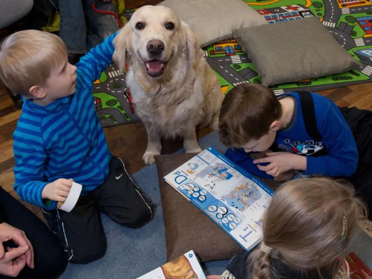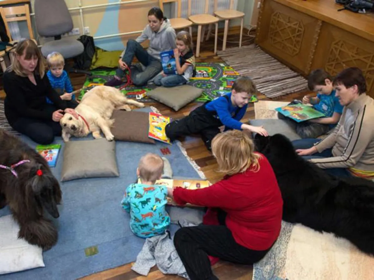 في إحدى مكتبات أستونيا يقرأ أطفال كتباً بصوت عال على مسمع كلاب، وهو أسلوب يرمي إلى تشجيع الأطفال على الثقة بأنفسهم.