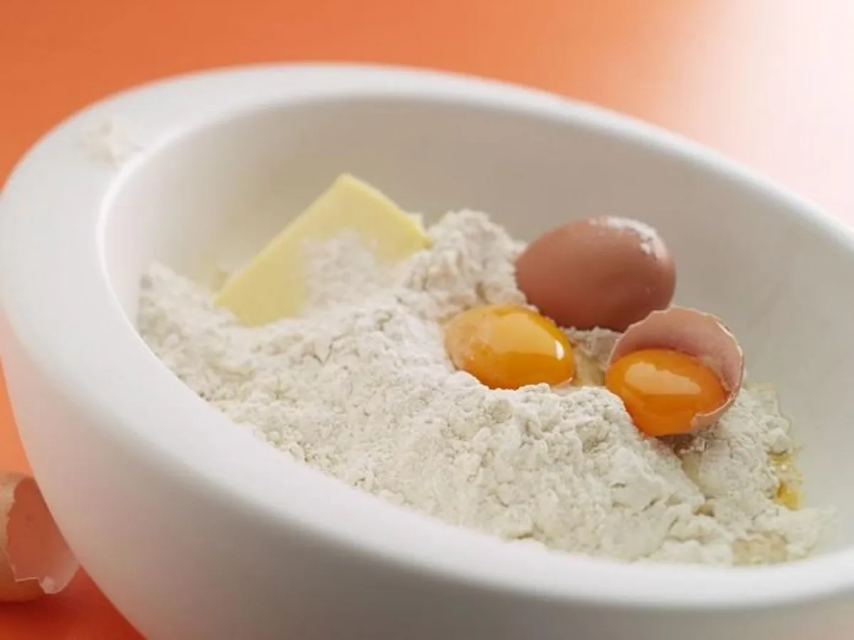 2 -يسخّن الفرن على حرارة 200 درجة مئوية.يطرح القسم الأكبر من العجينة، ويستخدم للطبقة التحتية من الفطيرة، مع إيداع القليل منها يفيض إلى خارج القالب. وتبرّد في البرّاد، في أثناء تحضير الحشو.