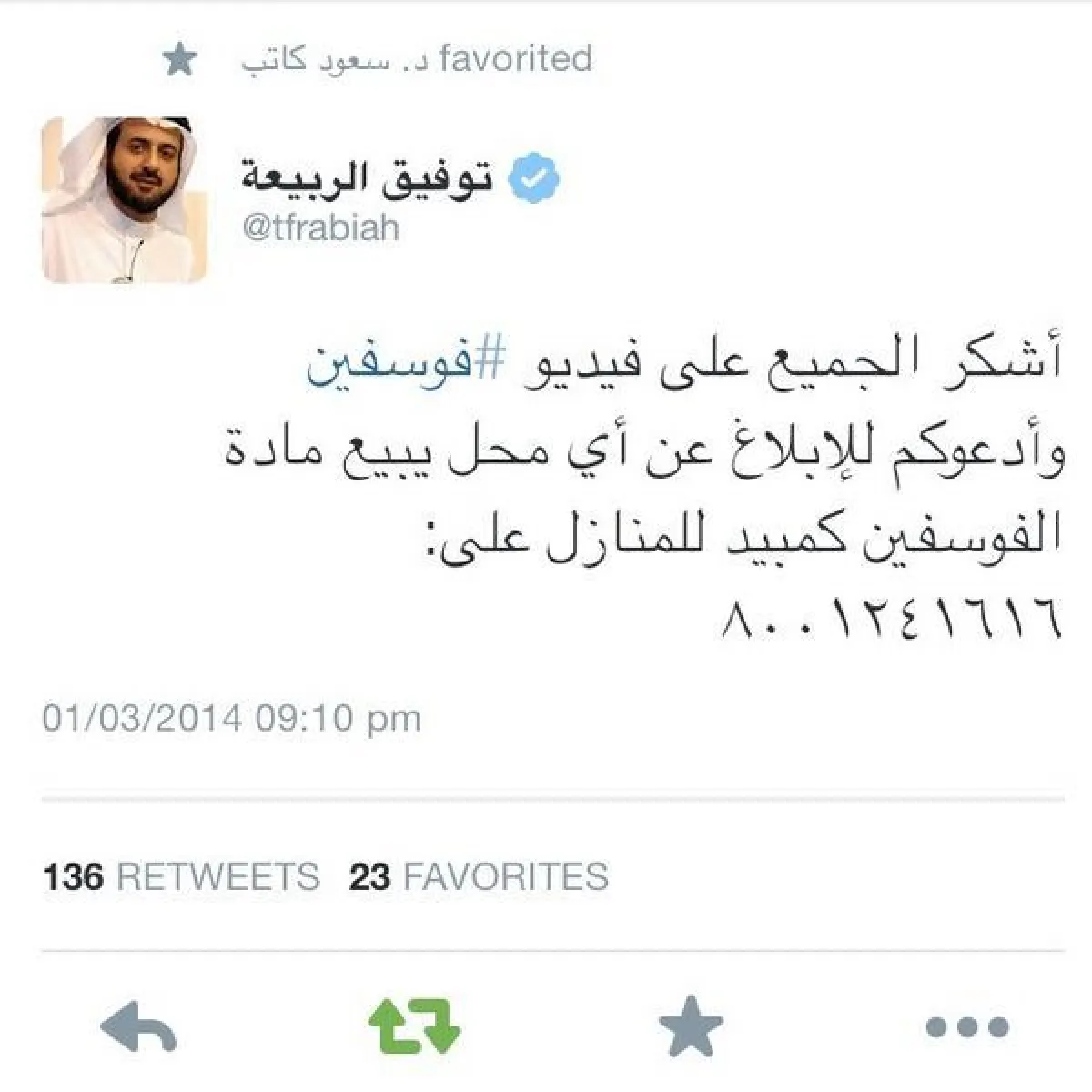 تفاعلا مع الحدث، غرد وزير التجارة توفيق الربيعة بعد إطلاق الفيلم بساعات عبر حسابه بـ “تويتر” مغرداً “أشكر الجميع على فيديو #فوسفين، وأدعوكم للإبلاغ عن أي محل يبيع مادة الفوسفين كمبيد للمنازل على: ٨٠٠١٢٤١٦١٦”.