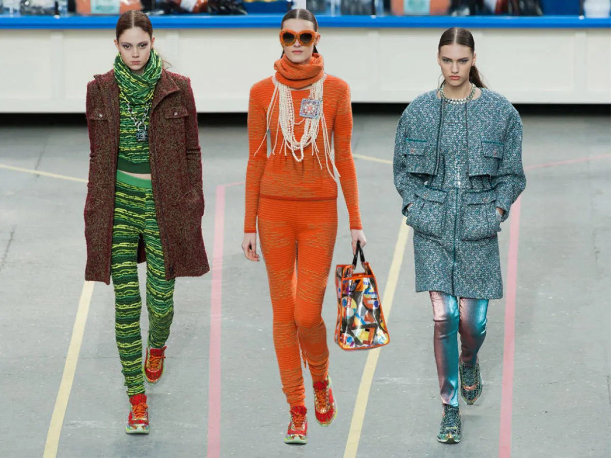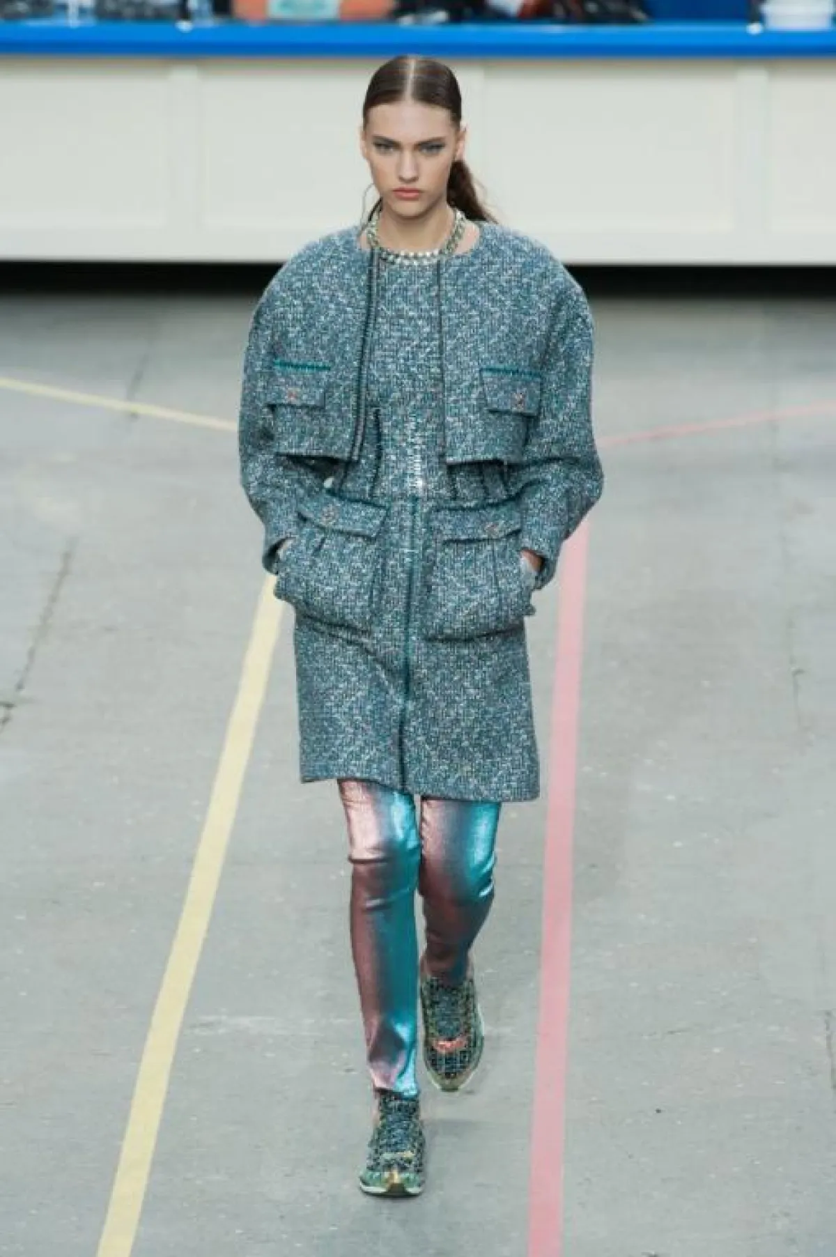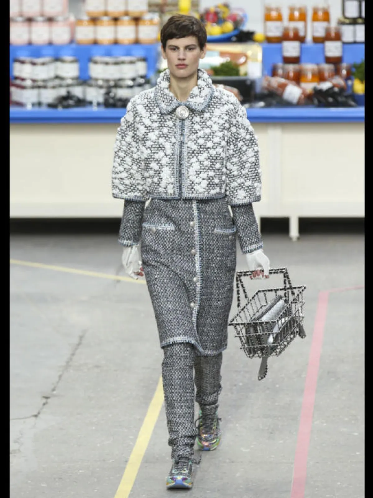 لأول مرة في تاريخ هذه الدار العريقة، تنزل أزياء "شانيل" إلى الشارع، بعد أن حوّل كارل لاغرفيلد القصر الكبير إلى "سوبر ماركت" كبيرة تجوّلت في وسطها العارضات مرتديات تايورات من التويد الملوّن. وكان قماش التويد حاضراً بقوّة في العرض، إذ صنعت منه المعاطف الشتوية العريضة والطويلة والسراويل الضيّقة والتايورات، وحتى الأحذية الرياضية الملوّنة التي تجوّلت بها العارضات براحة تامّة، وهي تحمل سلالاً من الفولاذ، كانت تضع فيها ما يحلو لها من موادّ غذائية تحمل "لوغو" "شانيل".