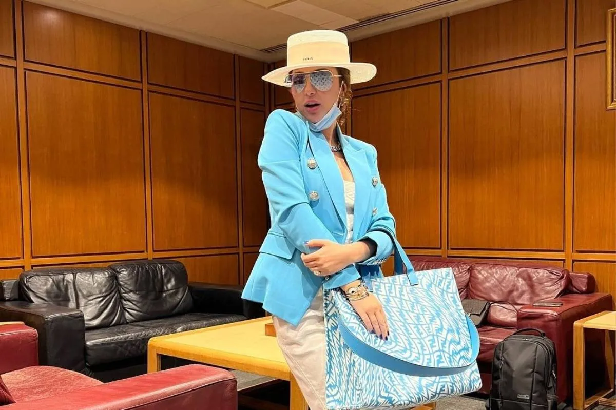 أطلت النجمة خلال سفرها إلى إمارة دبي بسترة زرقاء من بالمان مزدانة بصف من الأزرار مع سروال عملي بيج وبودي باللون نفسه، وانتعلت حذاء بيج، كما حملت حقيبة تسوق زرقاء مطبعة باللون البيج.الحقيبة الصفراء