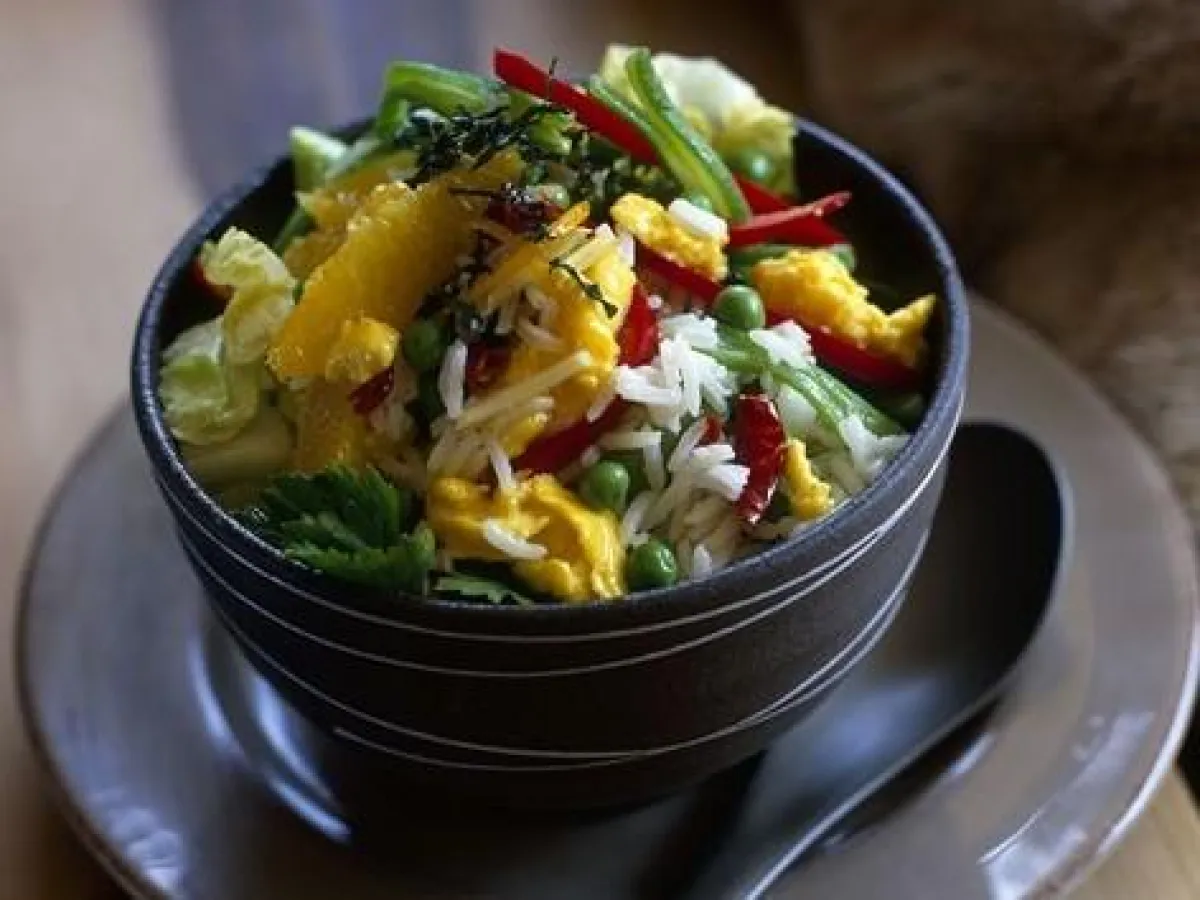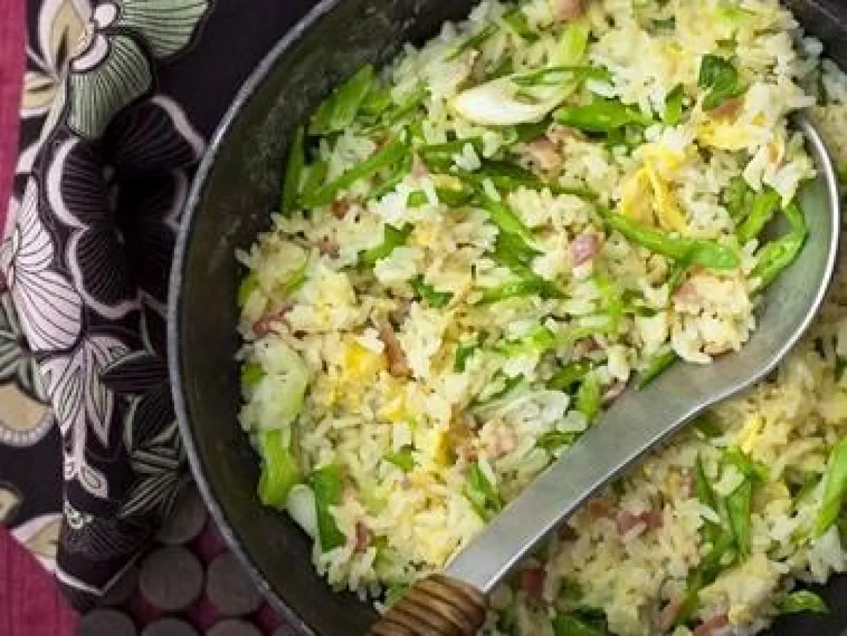 2- يقرّب الأرز بواسطة الملعقة من جوانب المقلاة، ويفقس البيض، في الوسط، مع التحريك لدقيقة، ثم يقدّم على الفور.
