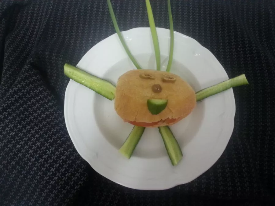 بعد تحضير السندويش التقليدي بحشو المارتديلا؛ قطعي حبة من الزيتون لتشكلي العيون والأنف، وباستخدام الخيار اصنعي أيدي وأرجلاً، ومن أوراق البصل الأخضر اصنعي الشعر.