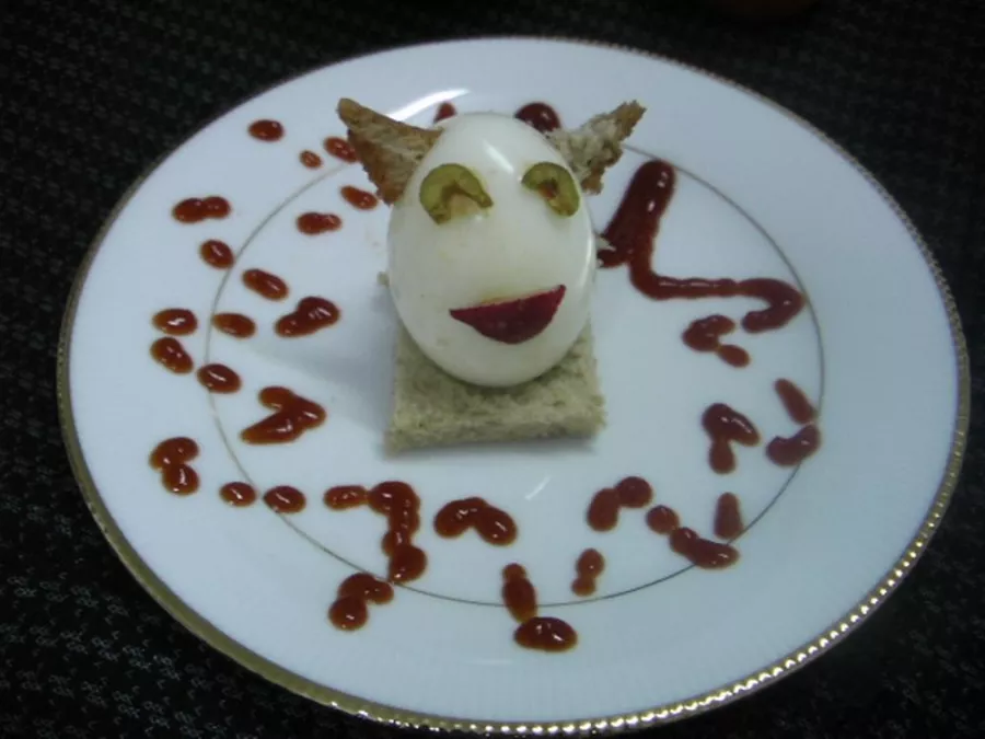 ليتناول طفلك البيضة المسلوقة كاملة؛ أقنعيه بأنها تبتسم له؛ واسلقي بيضة وقشريها وفرغي مثلثين صغيرين في الجزء الأعلى؛ لتتمكني من وضع الأذنين اللتين ستصنعينهما من أطراف خبز التوست، وقطعي شريحتي زيتون من المنتصف وثبتيهما في الجزء الأمامي من البيضة؛ فهاتان هما العينان، وألصقيهما باستخدام ذرات صغيرة من الكاتشب، ولتصنعي الفم؛ قشري جزءاً صغيراً من حبة فجل وشكليها على شكل نصف دائرة، ثم ضعي البيضة الضاحكة على مربع صغير من خبز التوست لتثبيتها.
