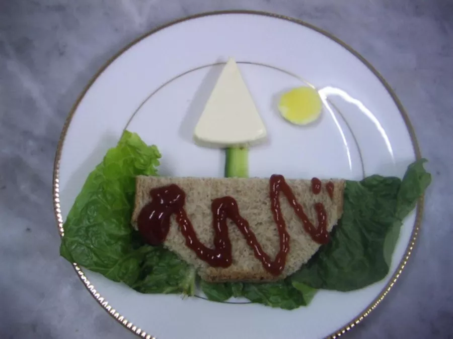 قصي خبز التوست لنصفي دائرة وادهنيهما من الداخل بالجبنة الخاصة بالدهن، وأغلقي السندويش لتشكيل جسم السفينة، وضعيها على الجزء الأخضر من الخس الذي يمثل البحر، واصنعي من الخيار عمود الوصل ما بين السفينة والشراع، أمَّا الشراع؛ فسيكون عبارة عن قطعة من جبنة المثلثات، وقرص الشمس عبارة عن نصف صفار بيضة مسلوقة.
