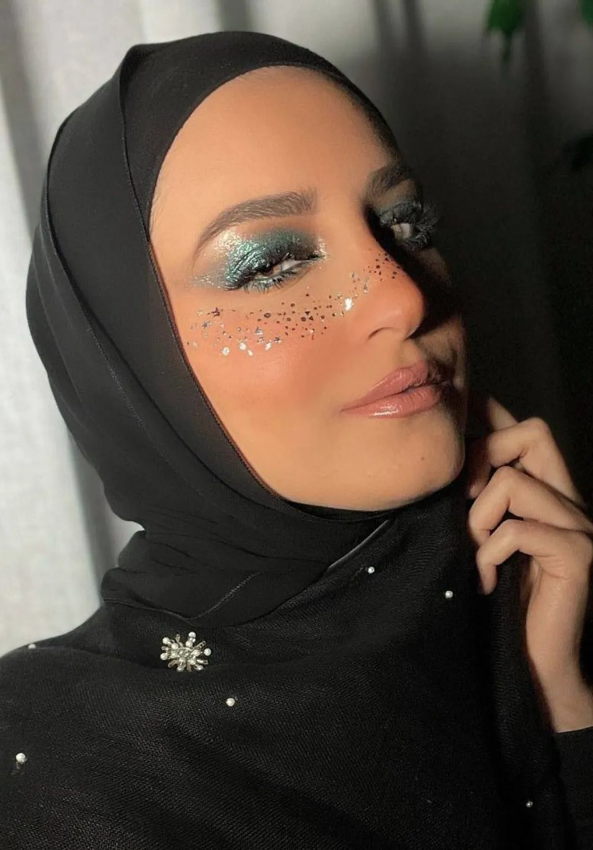 عادة ما يتم عمل مكياج ظلال العيون اللامعة "الجليتر" في المناسبات والسهرات، فمن المعروف أنه من بين أنواع المكياج الجريء الذي من شأنه أن يسلط الضوء على العينين ويمنح السيدة نظرة قوية وحادة، ولتتميزي في اليوم الوطني طبقيه بأسلوب اليوتيوبر الكويتية دلال الدوب، والتي استخدمت الجليتر الأخضر على الجفن المتحرك، وتزينت ببلاشر وأحمر شفاه باللون الزهري، مع إضافة استراس فضي على الوجنتين والأنف.