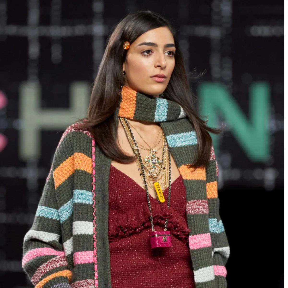 إذا كنتِ من محبات الكارديغان الملون خاصة في موسم الخريف؛ نرشح لك هذا التصميم من علامة شانيل Chanel حيث صمُم بقصّة طويلة من الصوف بأكمام طويلة واسعة، وجاء باللون الأخضر الداكن ومخطط بألوان فاتحة عريضة؛ ويمكنك ارتداؤه مع فستان طويل باللون الأحمر الداكن أو باللون الأسود؛ ونسقيه مع حقيبة كتف صغيرة باللون الوردي وسكارف قصير من الصوف بلوني الأزرق والبرتقالي .