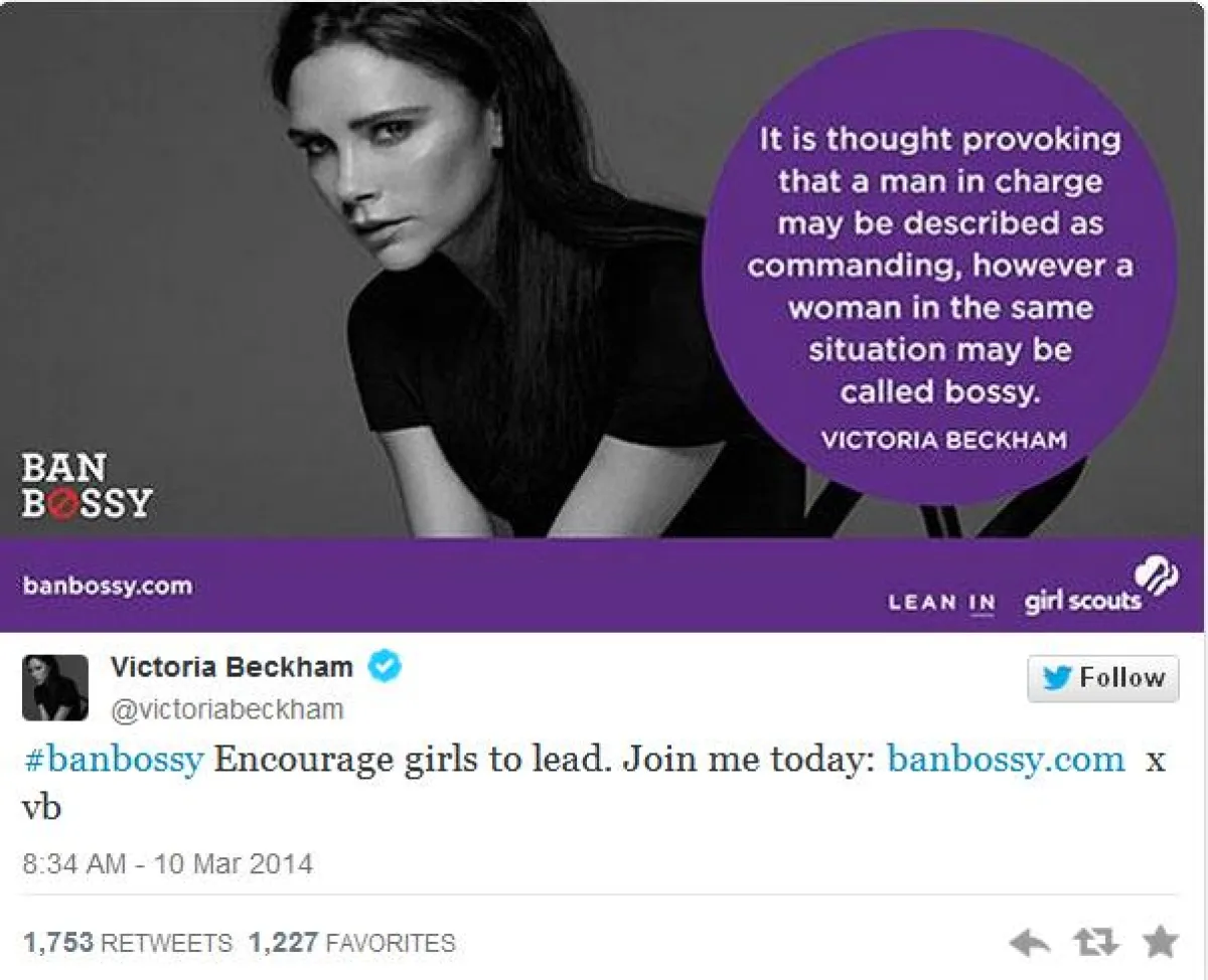 أما Victoria Beckham فنشرت على موقع "تويتر" صورة لها مع تعليق يؤكّد قيام الآخرين باعتماد صفة قيادي للرجل، وصفة المتسلّطة للمرأة، وطلبت تشجيع المرأة على القيادة.