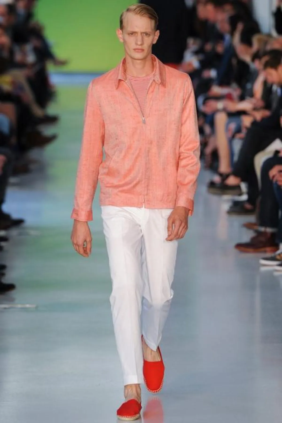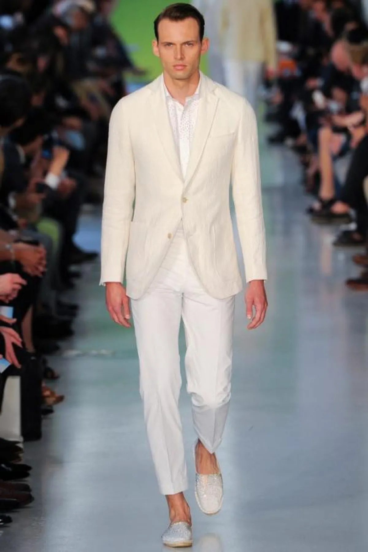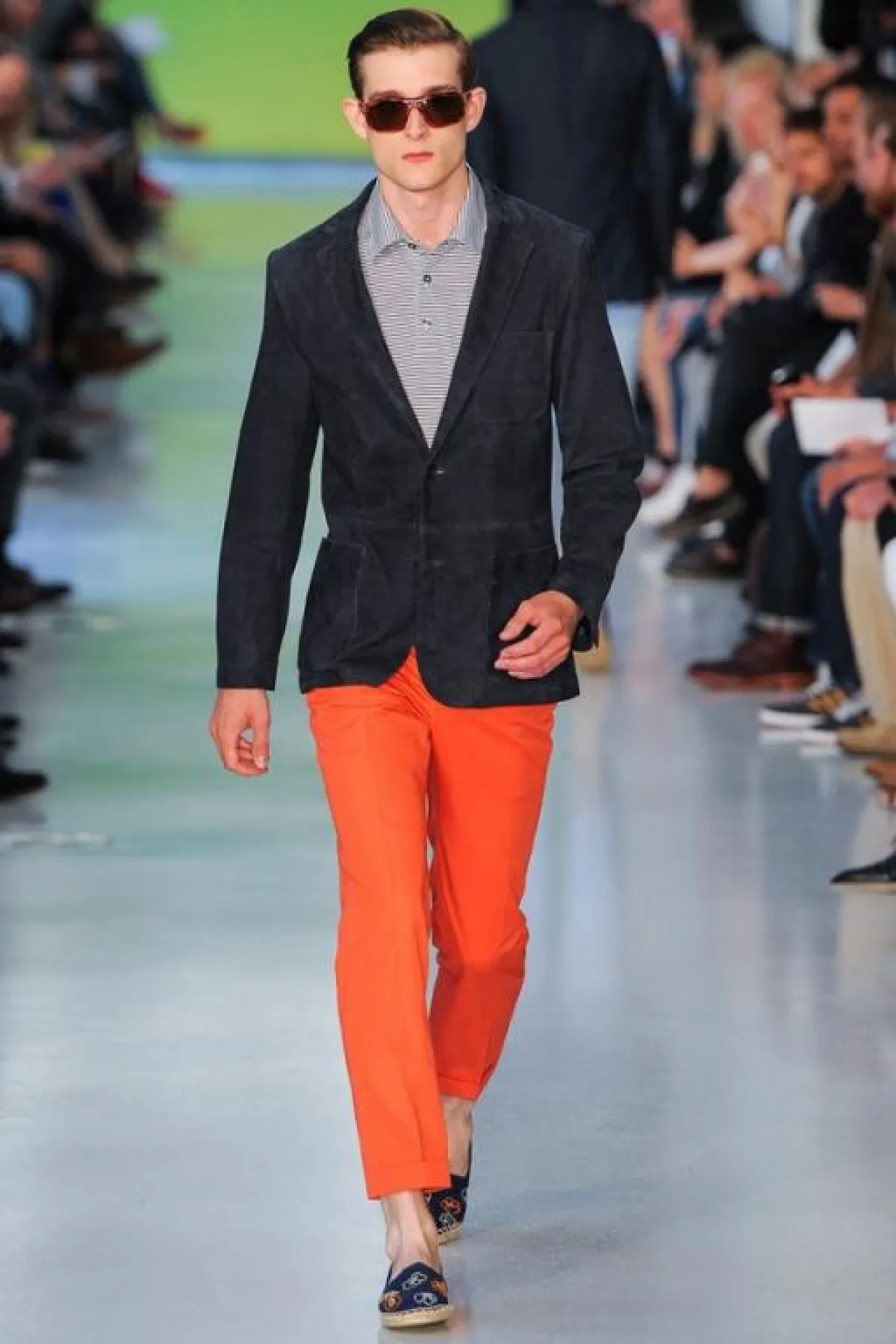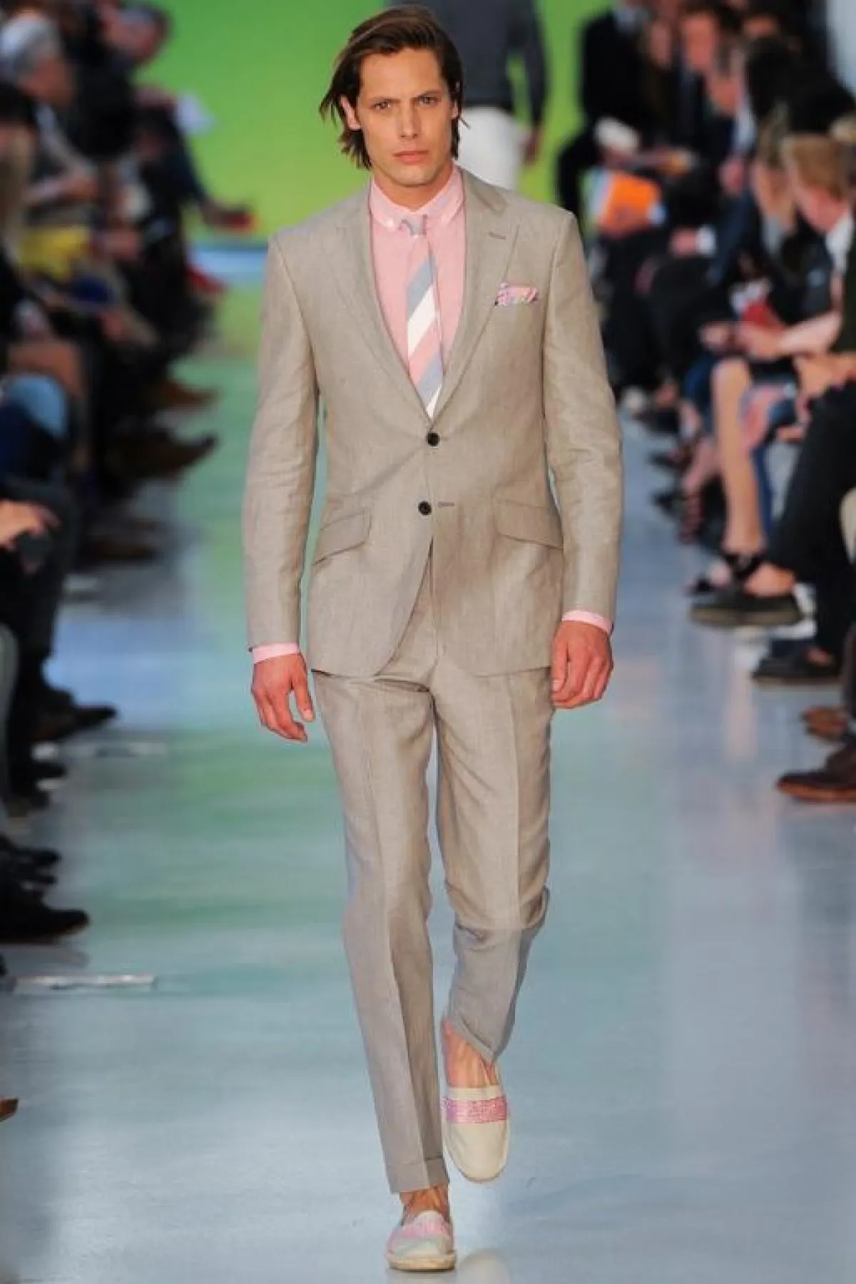 عادة ما تكون الألوان الحيادية والقاتمة والأساسية، كالأسود والأبيض والبني والرمادي والأزرق، هي الغالبة على دولاب ثياب الرجل. ولكن يبدو أنّ موسم الربيع والصيف لهذا العام قد غيّر قليلاً من قواعد اللعبة، وأغرق منصات العروض بالألوان الباستيلية والأخرى المضيئة والبراقة التي ظهرت في الطلات الرسمية أو الكاجول أو البين بين..أي أن كلّ الطرق تؤدي بالرجل الجريء إلى الألوان التي عليه مسايرتها وفتح دولاب ثيابه على مصراعيه لاستقبالها. ولا تشذّ مجموعة المصمّم البريطاني Richard James عن هذا التوجّه، إذ تضمّنت ثياباً واكسسوارات مستوحاة من مشهد الغروب، الذي يخمد فيه بريق الألوان الساطعة وتصير الغلبة للألوان الناعمة التي تبدو وكأنها قد فقدت كثيراً من لونها. وقد ظهر هذا واضحاً في توظيف James الذكي للورديّ المغبرّ والأزرق المائيّ والأصفر المبيضّ. أما الخطوط فقد كانت بسيطة وناعمة وكلاسيكية، وفق طريقة السهل الممتنع التي يجيدها هذا المصمّم أيّما إجادة. وقد كان حاذقاً في نقل خبرته في عالم الخياطة الإنجليزية الراقية، التي صاغها على شكل سراويل مريحة وجاكيتات منسابة على الجسم برشاقة وحيوية. أما مفتاح نجاح هذه الطلات فهو التأني في انتقاء الخامات والأقمشة التي لا بدّ من أن تُناسب مزاج الصيف من جهة، ونعومة الألوان من جهة أخرى.