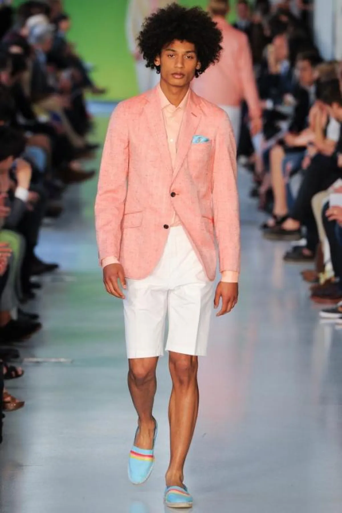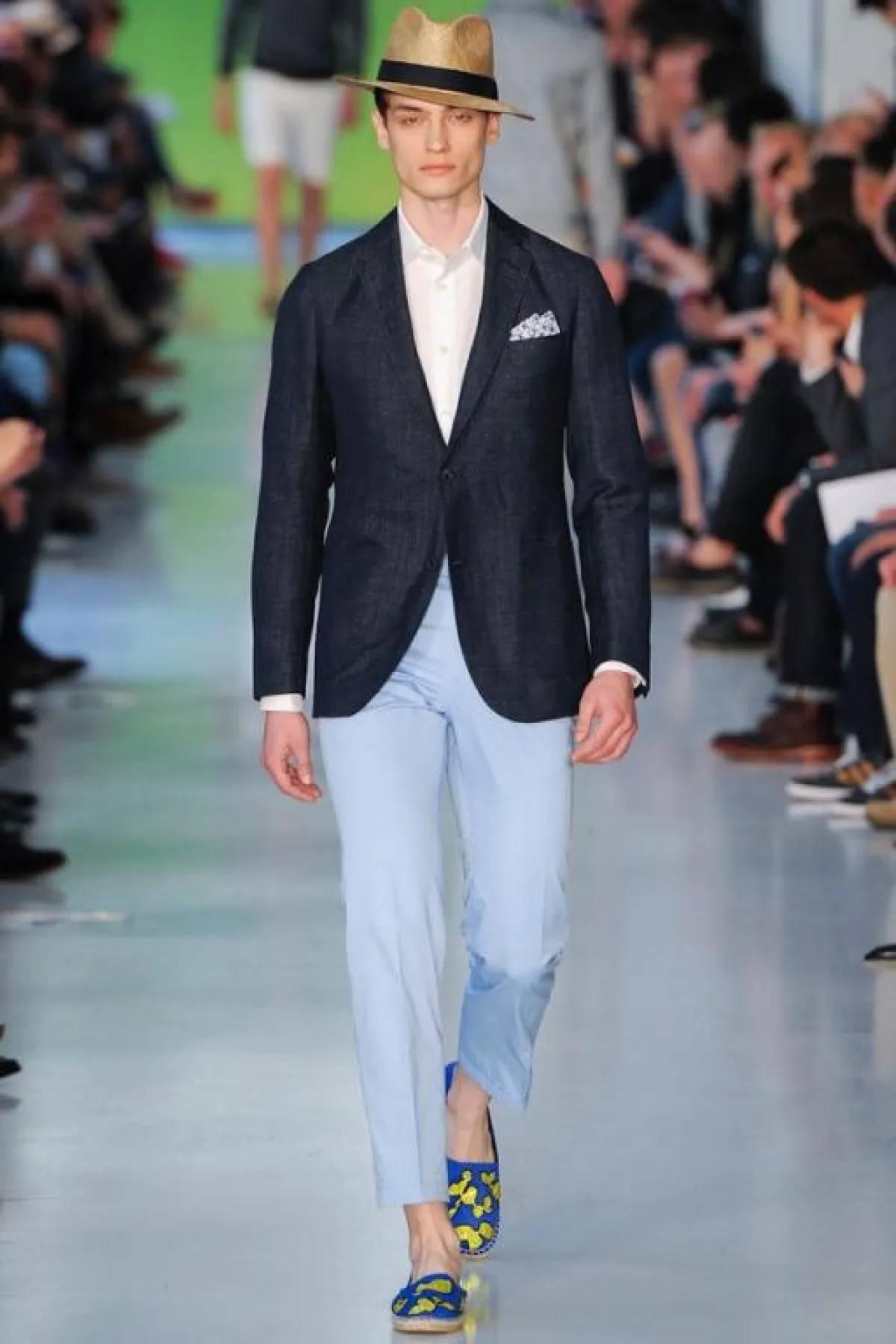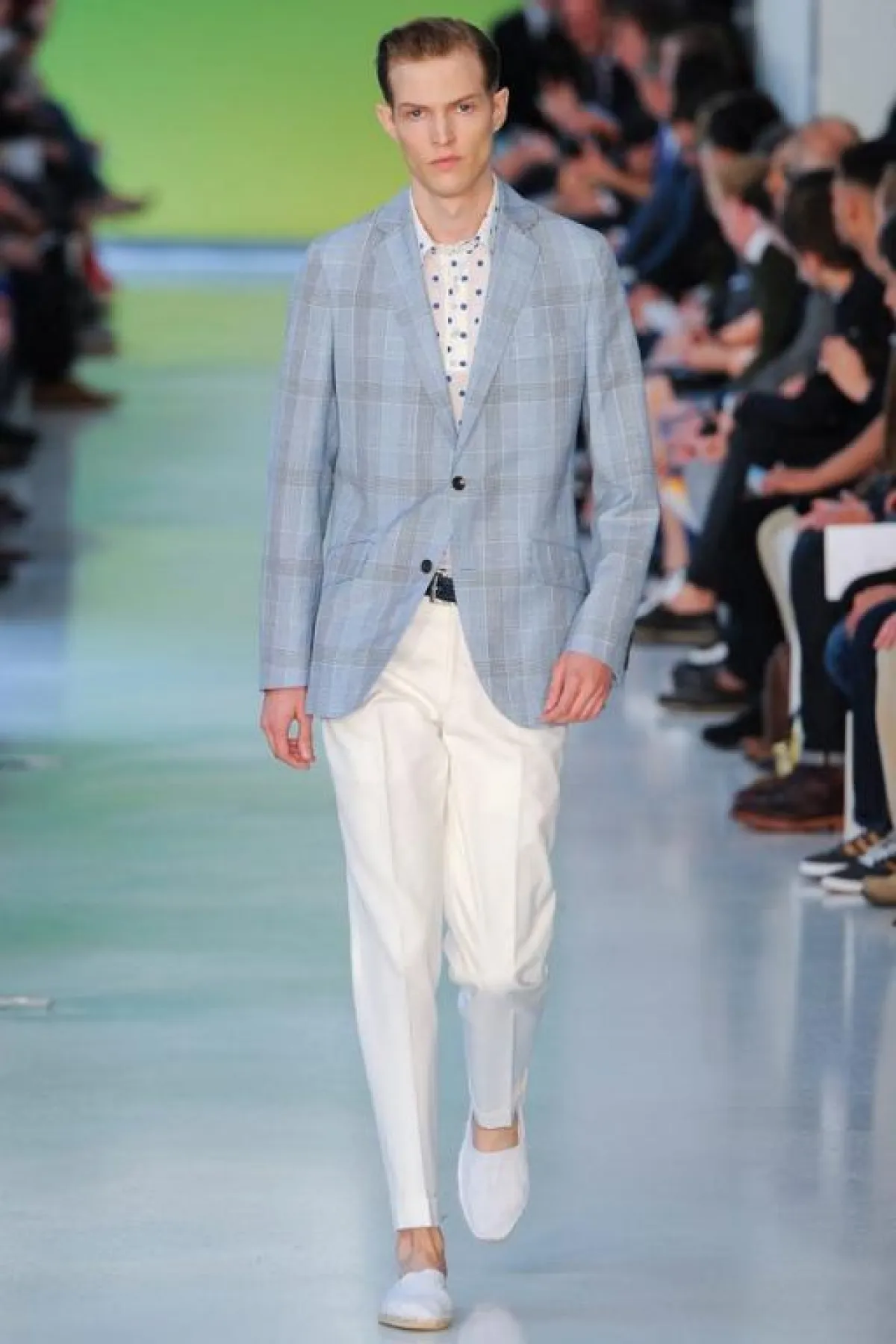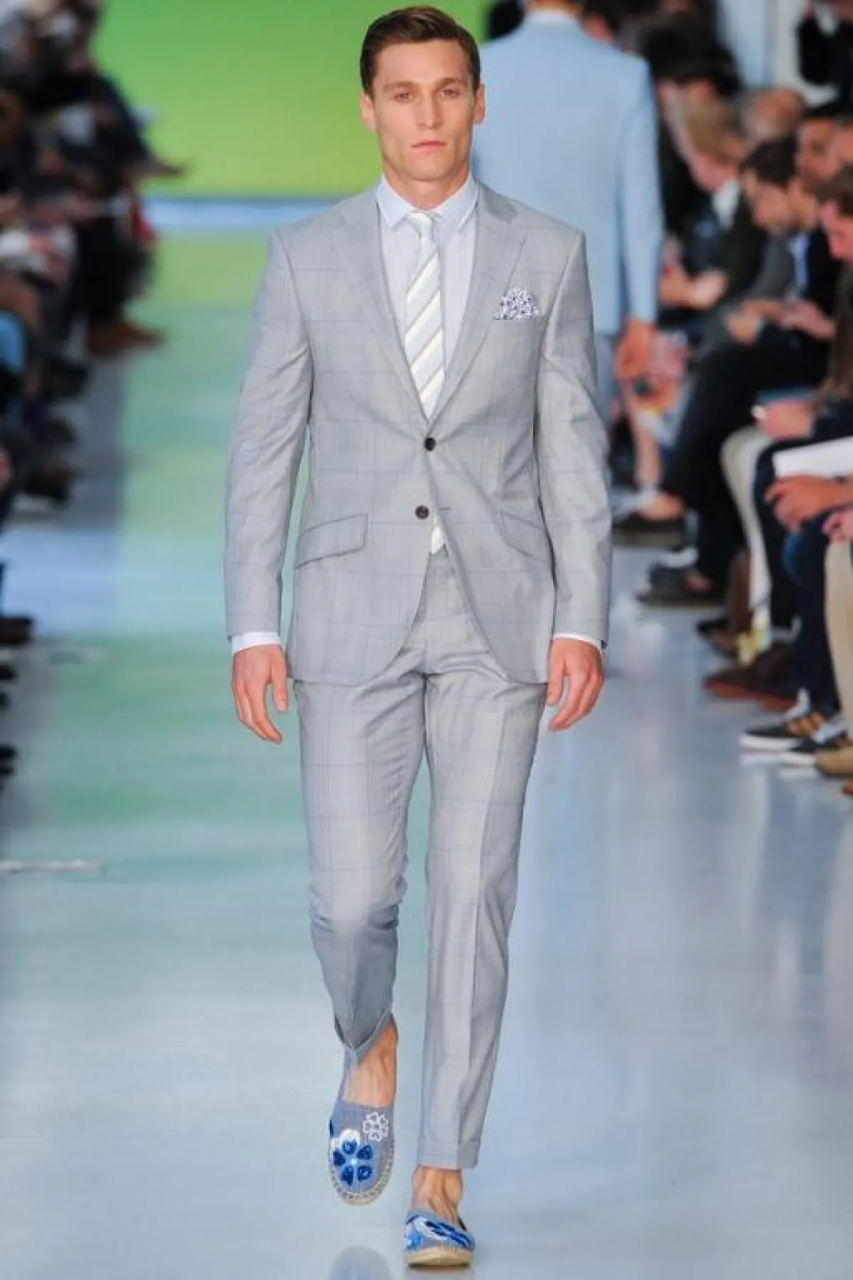 عادة ما تكون الألوان الحيادية والقاتمة والأساسية، كالأسود والأبيض والبني والرمادي والأزرق، هي الغالبة على دولاب ثياب الرجل. ولكن يبدو أنّ موسم الربيع والصيف لهذا العام قد غيّر قليلاً من قواعد اللعبة، وأغرق منصات العروض بالألوان الباستيلية والأخرى المضيئة والبراقة التي ظهرت في الطلات الرسمية أو الكاجول أو البين بين..أي أن كلّ الطرق تؤدي بالرجل الجريء إلى الألوان التي عليه مسايرتها وفتح دولاب ثيابه على مصراعيه لاستقبالها. ولا تشذّ مجموعة المصمّم البريطاني Richard James عن هذا التوجّه، إذ تضمّنت ثياباً واكسسوارات مستوحاة من مشهد الغروب، الذي يخمد فيه بريق الألوان الساطعة وتصير الغلبة للألوان الناعمة التي تبدو وكأنها قد فقدت كثيراً من لونها. وقد ظهر هذا واضحاً في توظيف James الذكي للورديّ المغبرّ والأزرق المائيّ والأصفر المبيضّ. أما الخطوط فقد كانت بسيطة وناعمة وكلاسيكية، وفق طريقة السهل الممتنع التي يجيدها هذا المصمّم أيّما إجادة. وقد كان حاذقاً في نقل خبرته في عالم الخياطة الإنجليزية الراقية، التي صاغها على شكل سراويل مريحة وجاكيتات منسابة على الجسم برشاقة وحيوية. أما مفتاح نجاح هذه الطلات فهو التأني في انتقاء الخامات والأقمشة التي لا بدّ من أن تُناسب مزاج الصيف من جهة، ونعومة الألوان من جهة أخرى.