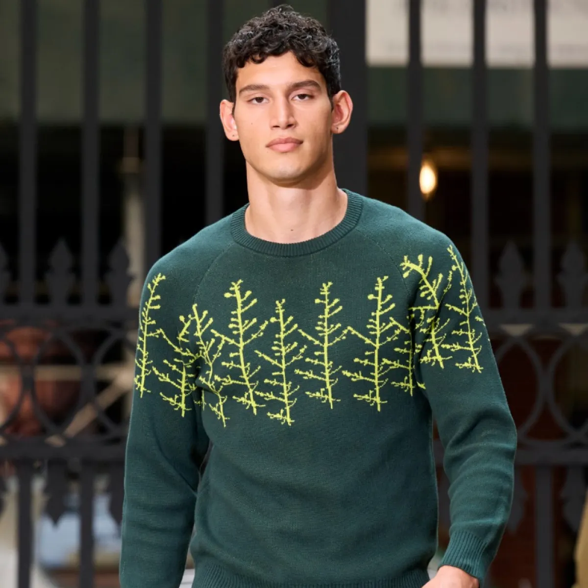 للشاب الأنيق والعصري يمكنك اعتماد هذا البلوفر من علامة بارك رونين Parke & Ronen حيث صمم من الصوف بقصّة شبابية مصنوع من الصوف باللون الأخضر الداكن بأكمام طويلة ورقبة دائرية ومزين بأغصان الشجر باللون الأخضر الفاتح؛ ويمكنك تنسيقه مع قميص باللون الأخضر المينت أو باللون البيج مع سروال باللون الأخضر الفاتح أو الأسود .