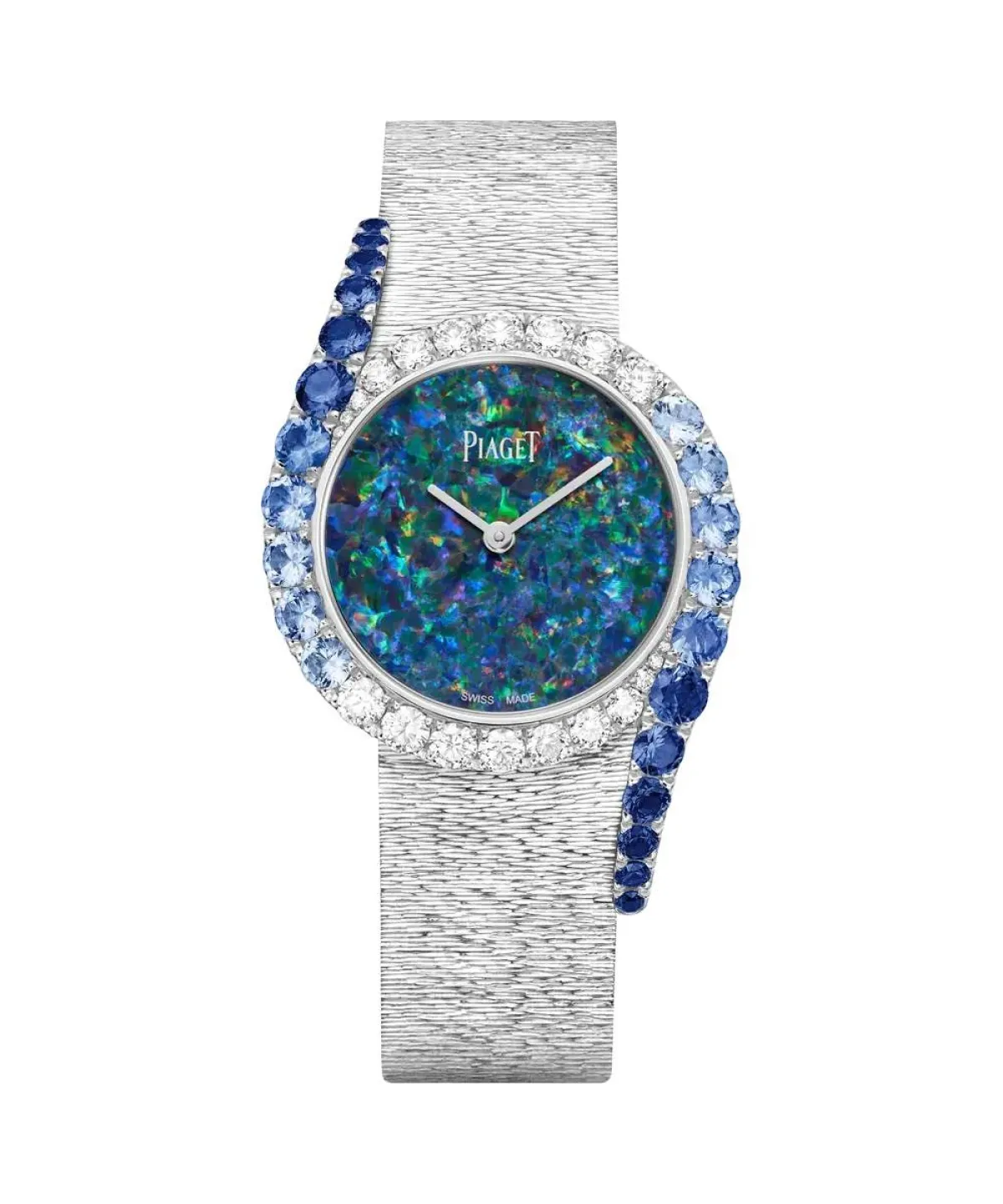 تمنحكِ الساعة مظهراً أكثر وقارًا وجاذبية في مختلف إطلالاتكِ اليومية، لذلك اخترنا لكِ من الساعات المرصوفة بأحجار الأوبال ساعة Limelight Gala Precious من دار بياجيه Piaget، التي يُمكنكِ أن تخطفي بها الأنظار في إطلالات السهرات، نظرًا لتصميمها اللافت الذي يمزج بين الألماس والأوبال والياقوت والذهب الأبيض المزخرف. صُممت الساعة من علبة دائرية كبيرة من الذهب الأبيض عيار 18 قيراط وجاءت مرصعة بـ 20 ماسة قطع بريانت (قرابة 1.46 قيراط) و 22 ياقوت قطع بريانت (قرابة 4.01 قيراط)، مع ميناء على شكل لوحة قاعدة من الأوبال تزن قرابة 2 قيراط، فيما صُمم سوار الساعة من الذهب الأبيض عيار 18 قيراط.