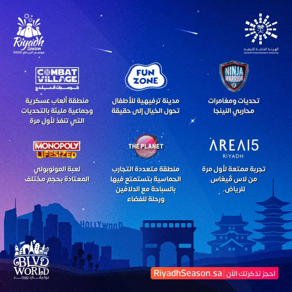 وتعد منطقة "بوليفارد وورلد" أبرز المناطق في موسم الرياض، حيث توفر أكبر بحيرة صناعية في العالم، وتتيح لزوارها التنقل من مدينة إلى أخرى عبر 11 محطة، إضافةً إلى أكبر مسرح كروي في العالم، مع مدينة ألعاب لعشاق الحماس والإثارة، وغيرها من التجارب الترفيهية التي تناسب جميع الفئات، ويمكن حجز تذاكر الدخول للمنطقة من خلال الرابط.