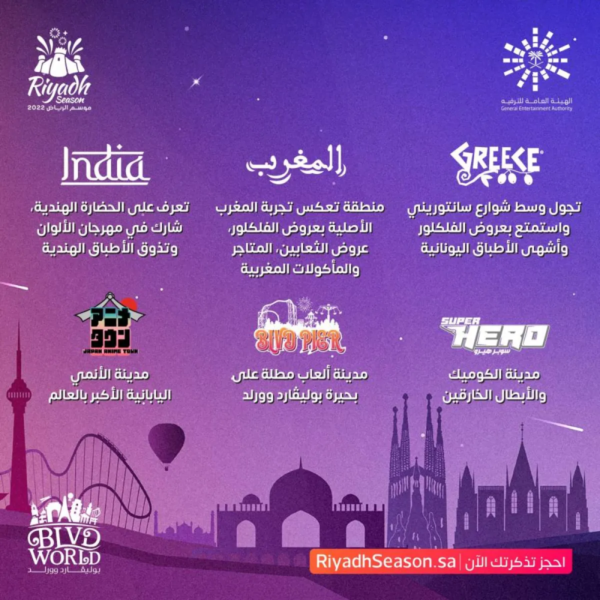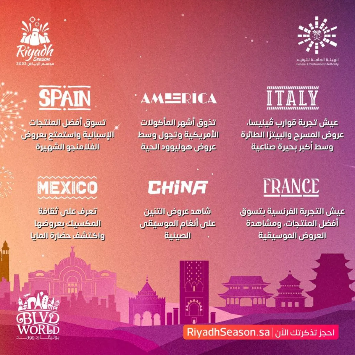 ويتعرف زوار موسم الرياض عبر منطقة "بوليفارد وورلد" على ثقافة المكسيك واكتشاف حضارة المايا، والتجول وسط شوارع إيطاليا والاستمتاع بعروض الفلكور وأشهى المأكولات اليونانية، كما أن الزوار مدعوون للمشاركة في مهرجان الألوان للتعرف على الحضارة الهندية وتذوق أشهى مأكولاتها، فيما تعكس تجربة المغرب حضارتها وفلكورها من خلال عرض الثعابين والمتاجر والمأكولات.