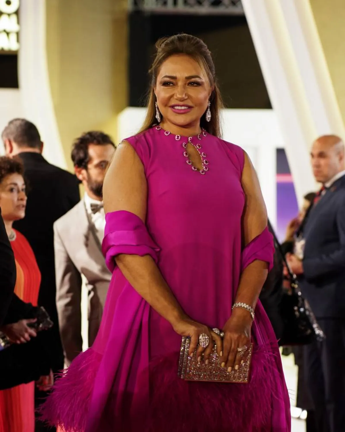 ارتدت الفستان الفوشيا المزدان بريش النعام من الأسفل، وهو لون يليق بها ويتميز بقصة مقفولة وياقة مزخرفة بالأحجار الملونة ومفتوحة، وقد تزينت بمجوهرات ماسية من إيرام جولري Iram Jewelry.