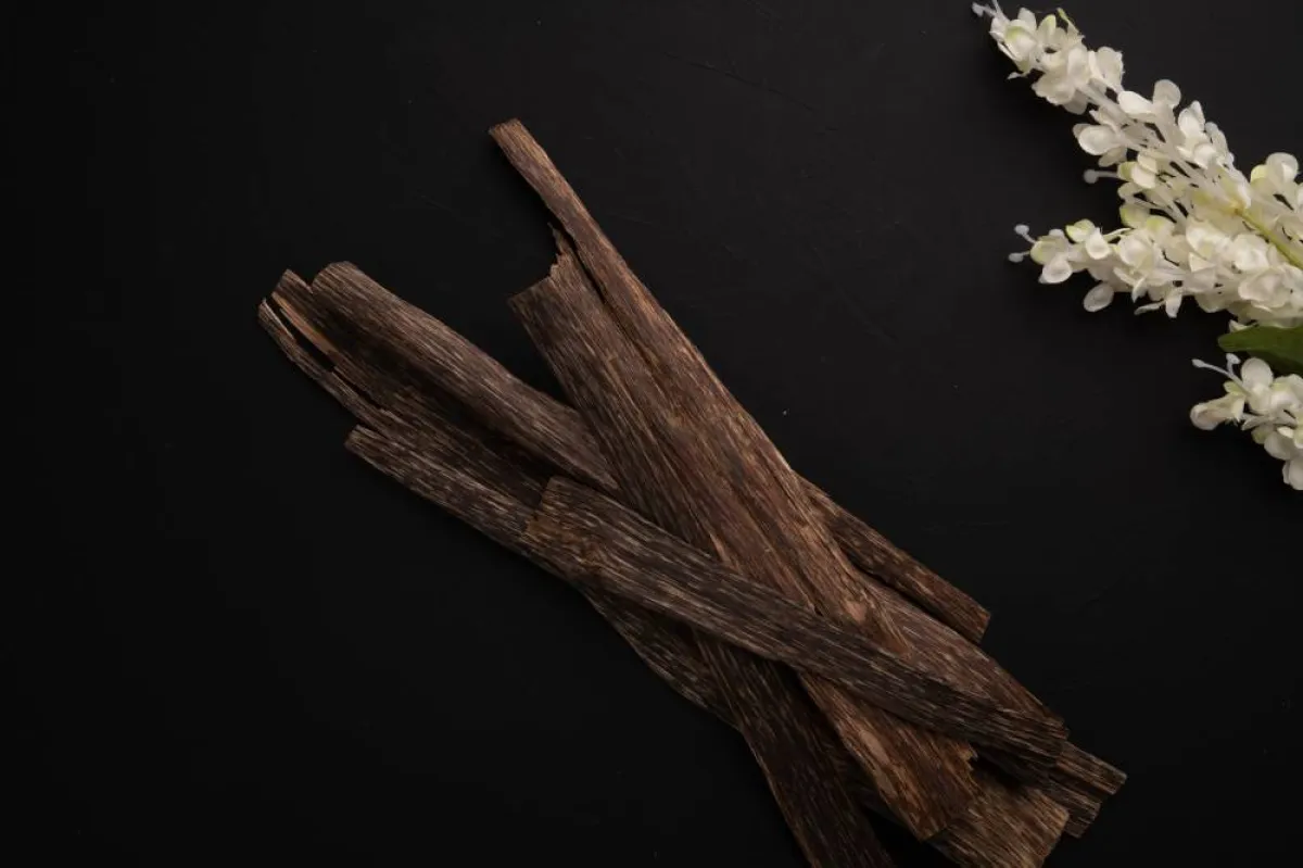 يُعرف أيضاً باسم زيت العود لأنه يتم الحصول عليه من خشب شجرة استوائية برية تسمى آجار. وهو ثمين للغاية لأن 2 في المئة فقط من أشجار الآجار تنتج زيت خشب العود. ويعد الـ Phialophora Parasitica نوعاً من العفن الذي يصيب خشب العود، يعمل على إنتاج راتنج ذو رائحة قوية ولون داكن يُسمى العود. ويُعتبر العود من أغلى مكونات العطور الطبيعية في العالم نظراً لارتفاع الطلب عليه وندرته والعمل الشاق فيه، وقد وصفه بعض الخبراء بالذهب السائل.
