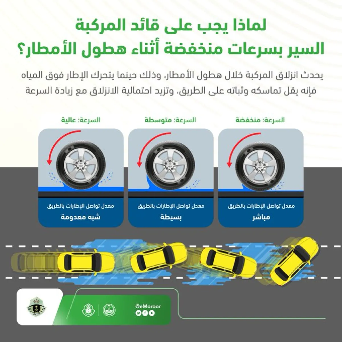 طالبت الإدارة العامة للمرور، القيادة بسرعات منخفضة أثناء هطول الأمطار لأنها تسهم في تعزيز السيطرة على المركبة خلال اللحظات الحرجة وجاء ذلك من خلال حسابها الرسمي بموقع التواصل الاجتماعي "تويتر".