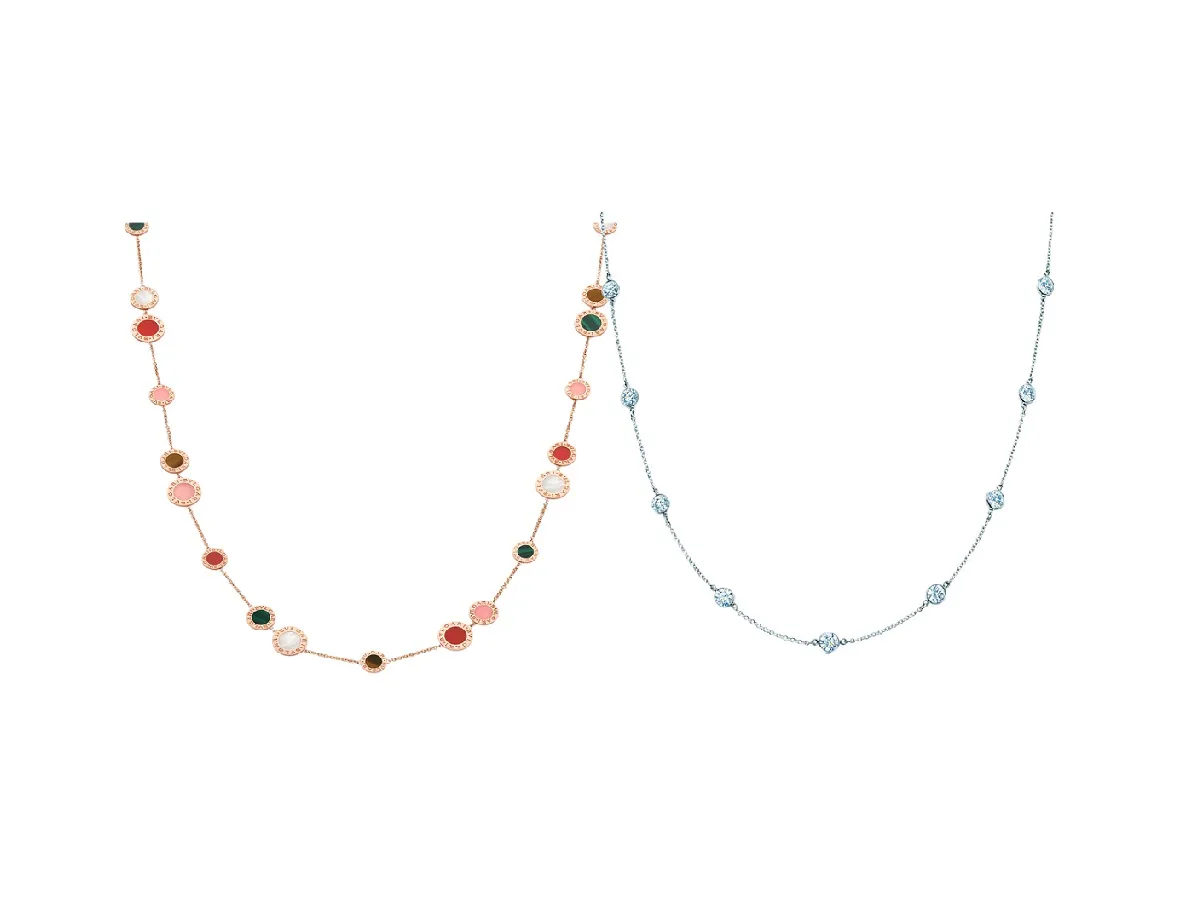 اخترنا لكِ هذه القلادة من بلغاري Bvlgari المستوحاة من التراث الروماني والحديث بأناقة. بلغاري بلغاري sautoir هو تعبير معاصر عن الفخامة؛ وجاءت القلادة بتصميم مرح مزينة بعدة أحجار كريمة؛ وصممت من الذهب الوردي عيار 18 قيراطًا مع تطعيمات من عرق اللؤلؤ والأوبال الوردي وعين النمر والملكيت والعقيق.