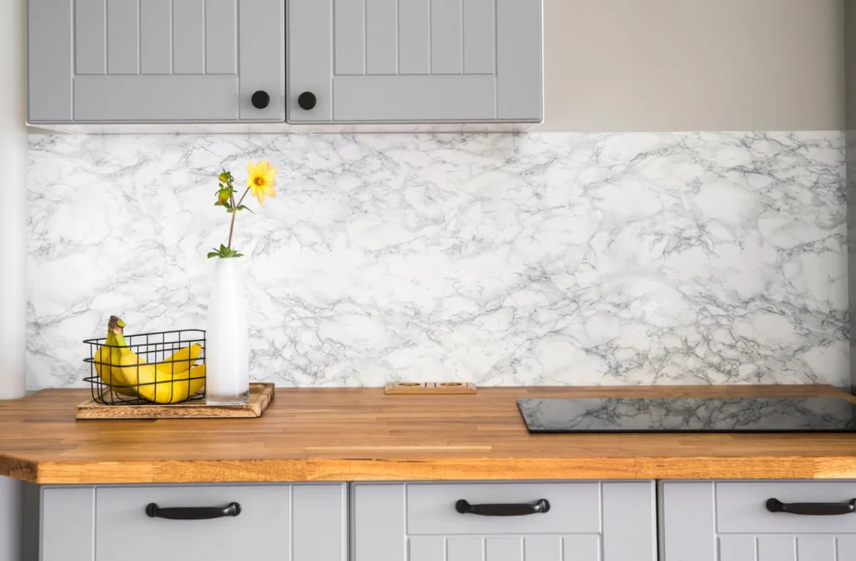 مادة بديل من الرخام مصنوعة من البلاستيك تكسو "الباكسبلاش" أي المساحة الفاصلة بين "الكونترتوب" والخزائن العلوية في المطبخ (الصورة من shutterstock)