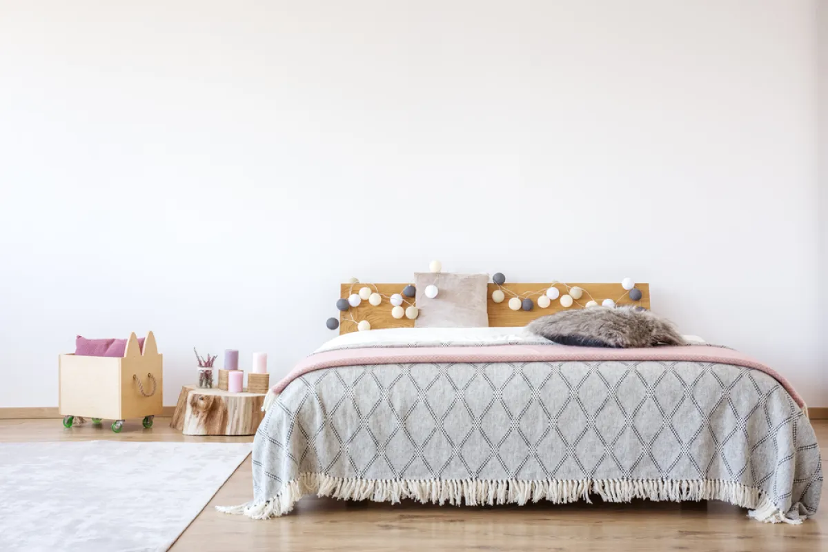 • يُختار السرير، حسب مساحة الغرفة؛ يُفضَّل أن يكون بطول 140 سنتيمترًا، وألا يقلّ عن 90 سنتيمترًا، مع الحرص على أن يكون تصميمه بسيطًا، ويتماشى مع قطع الأثاث الأخرى، بفضل ألوانه الهادئة.