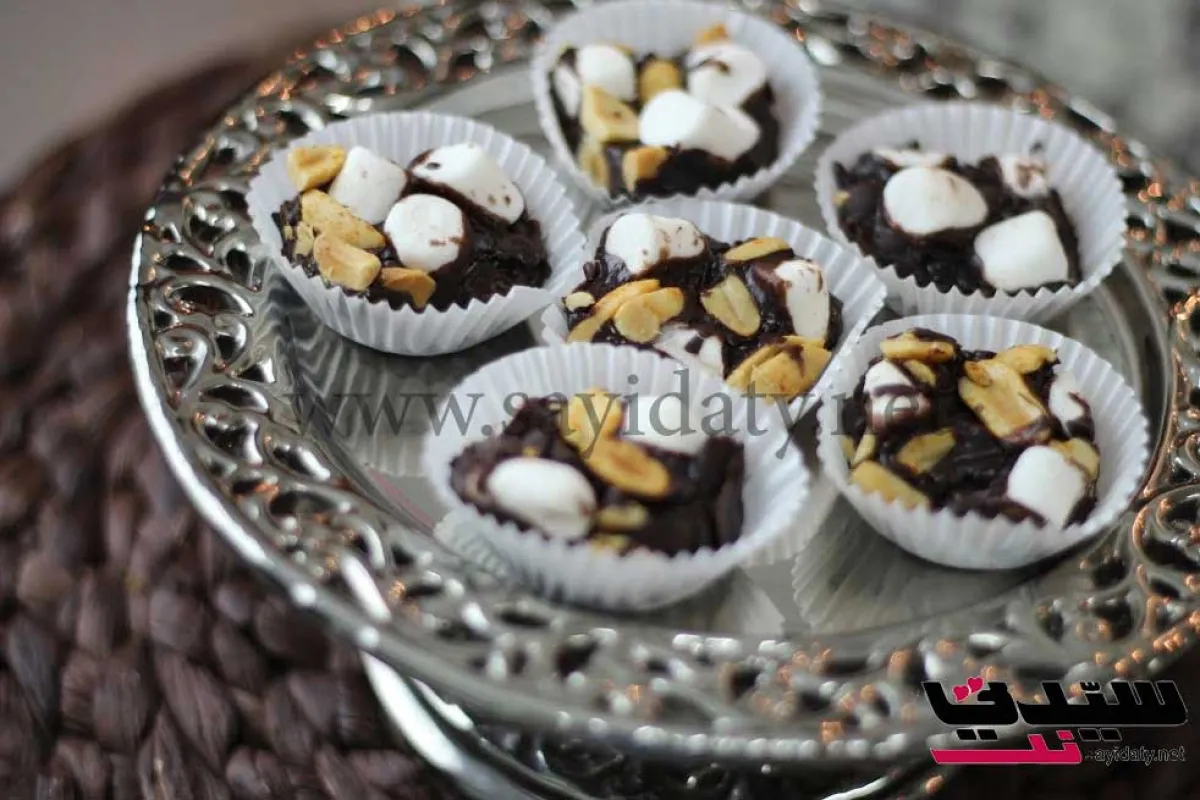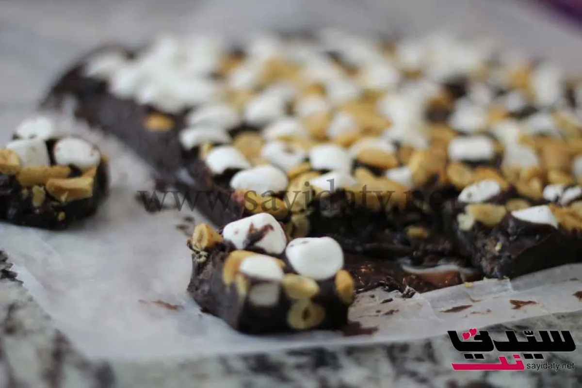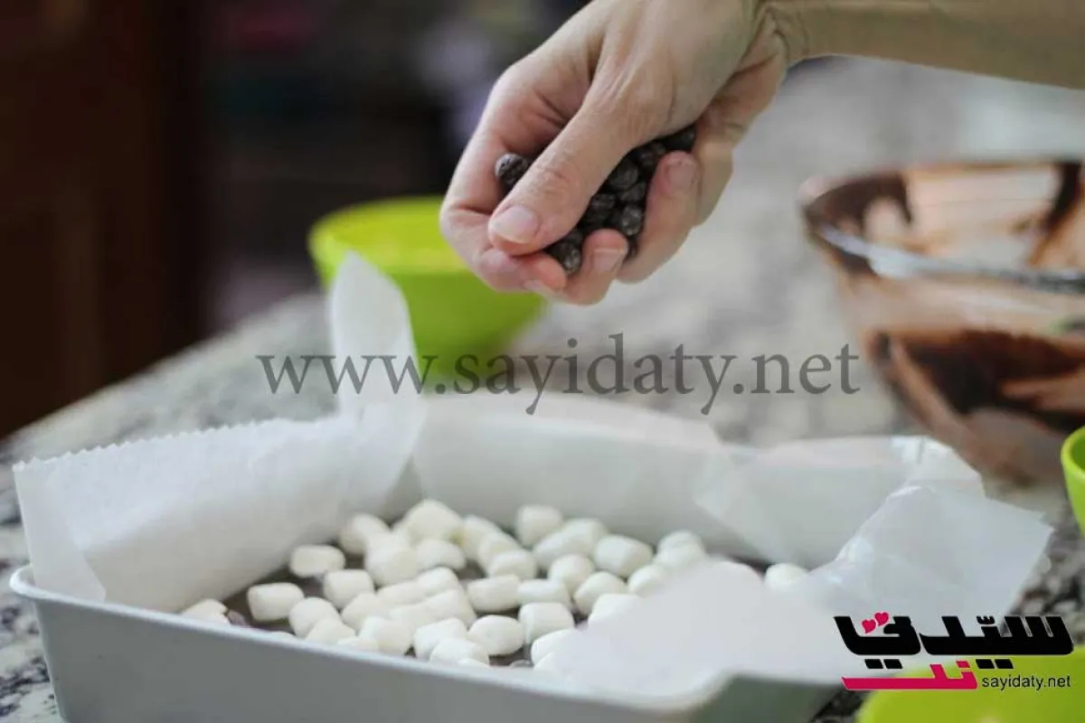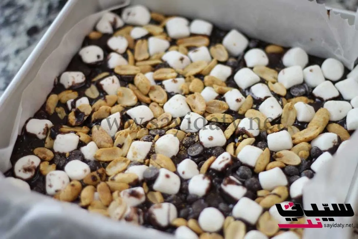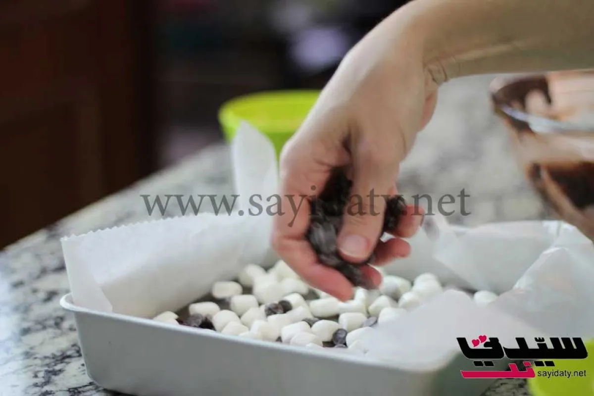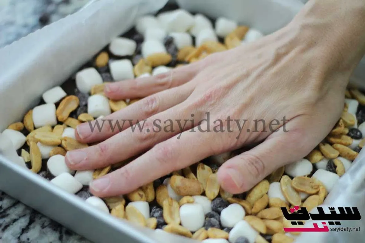 4. يضاف المارشملو وقطع الشكولانة والفول السوداني وترص المكونات