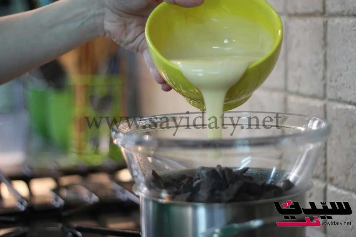 2. نضيف الحليب والكربونات والملح إلى خليط الشوكولاتة على الحمام المائي لتختلط المكونات