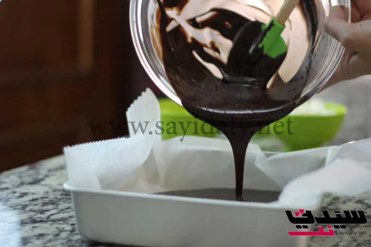 3. تضاف الفانيلا ويحرك المزيج ويصب في صينية مربعة مبطنة بورق الخبز