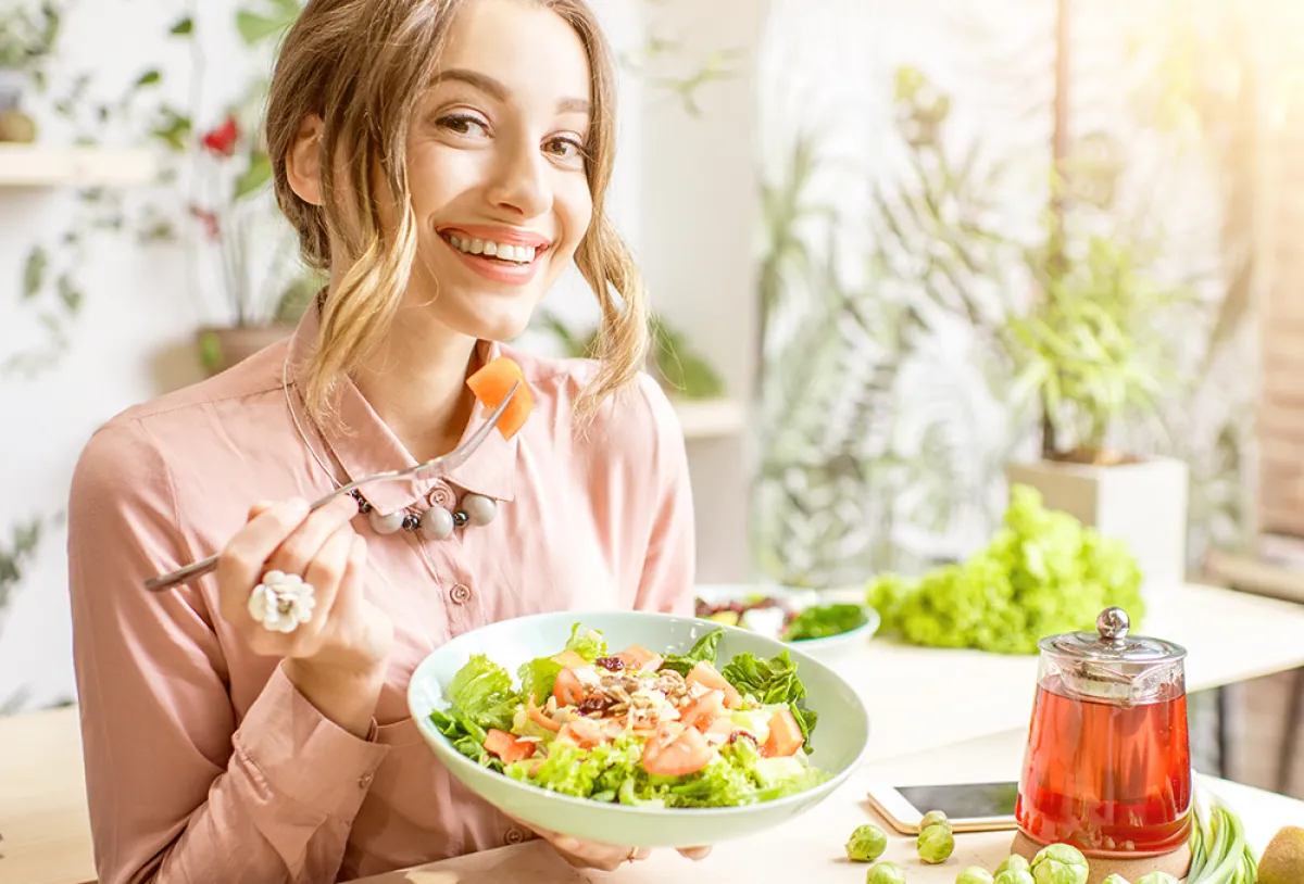 2. يُفضَّل اختيار الوجبات الغنيَّة بالخضراوات، كالسلطات. لكن، يجدر الانتباه إلى الصلصات المضافة إلى أطباق السلطة. علمًا أنه يمكن اكتساب حتَّى ألف سعرة حرارية و85 جرامًا من الدهون، مع تناول السلطة المُضافة إليها صلصة الجبن الأزرق، مثلًا.