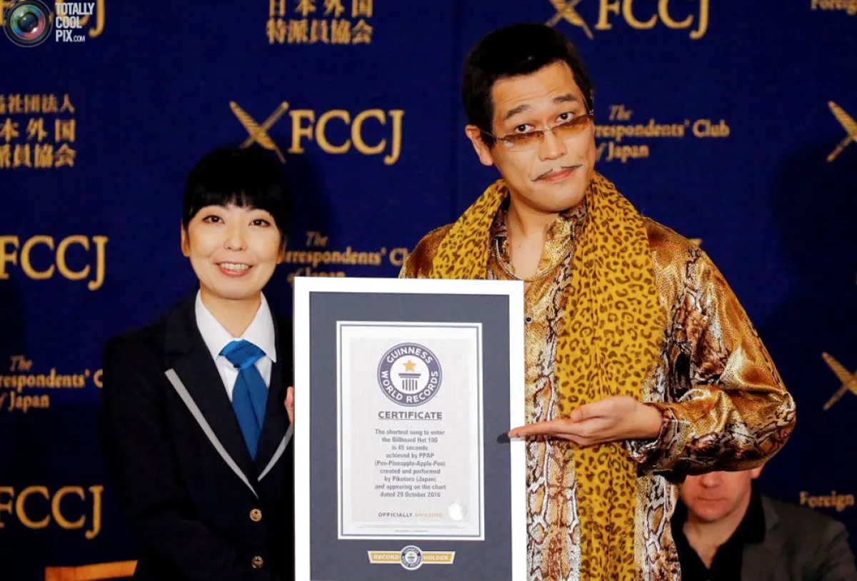 كان هذا شكل أغنية ""Pen Pineapple Apple Pen لكوميديان ياباني، و التي نجحت بالدخول في موسوعة غينيس للأرقام القياسية كأقصر أغنية، و تمكّنت من أن تقتحم لائحة "بيلبورد هوت 100 " الأمريكية، حيث حصلت على أكثر من 181 مليون مشاهدة منذ نشرها على يوتيوب في أغسطس من عام 2016.