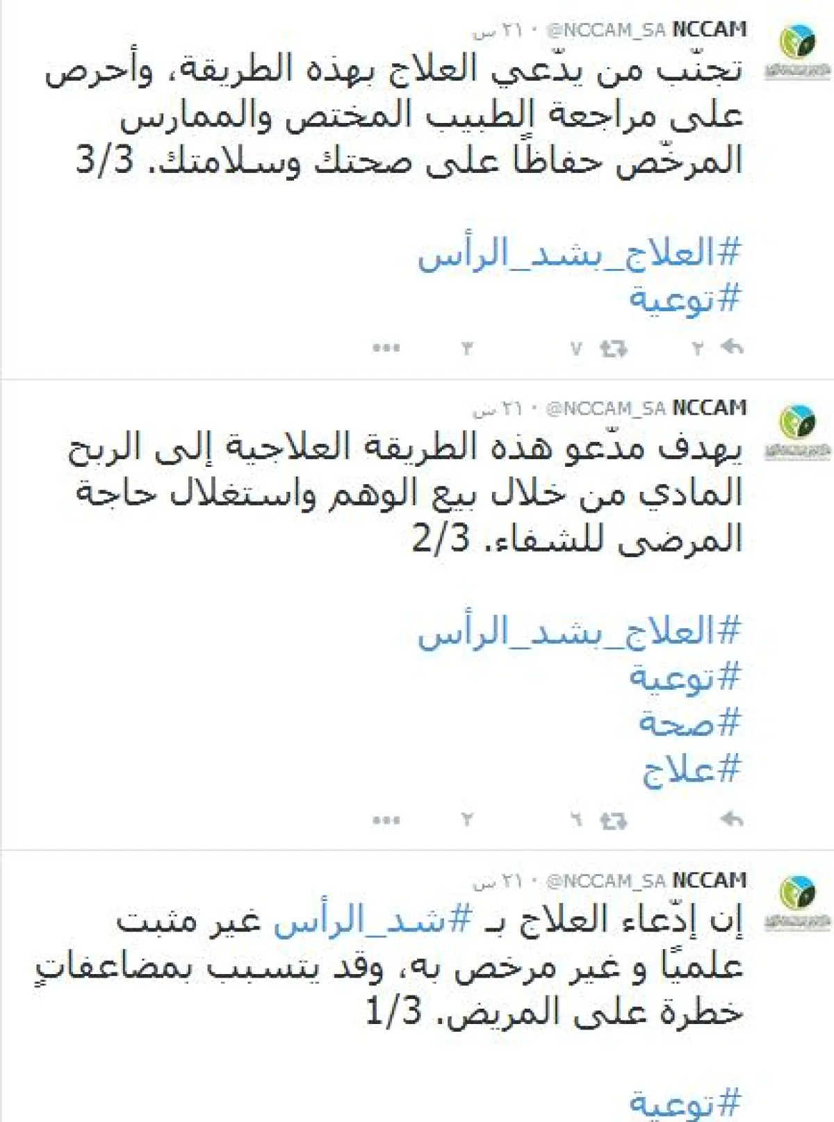 حذَّر المركز الوطني للطب البديل والتكميلي في وزارة الصحة السعودية ‏من العلاج بشد الرأس، قائلاً: إن ادعاء العلاج بشد الرأس غير مثبت علمياً وغير مرخص، وقد يتسبب في مضاعفات خطرة على المريض.