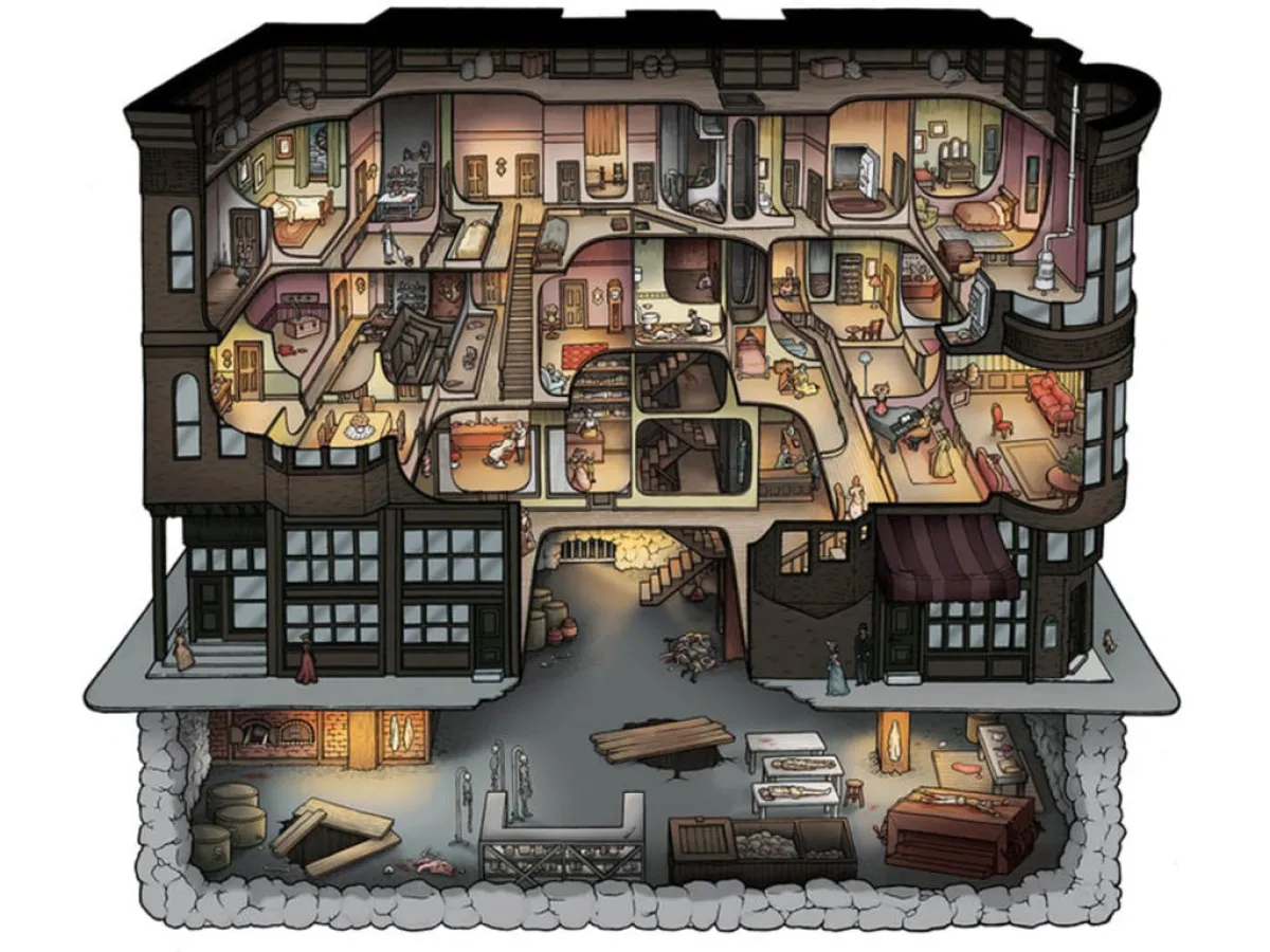 بنفسه، وأضاف فيه غرفاً مخفية، وأبواباً سرية، وحجرات تعذيب معزولة لكيلا يستطيع أحد من زوار الفندق