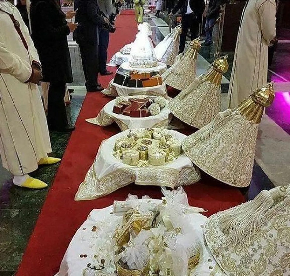 وعند بدء مراسم الزفاف دخلت العروس على إيقاع الزفة المغربية التقليدية التي غناها لها خصيصاً الفنان عبدو الصويري.