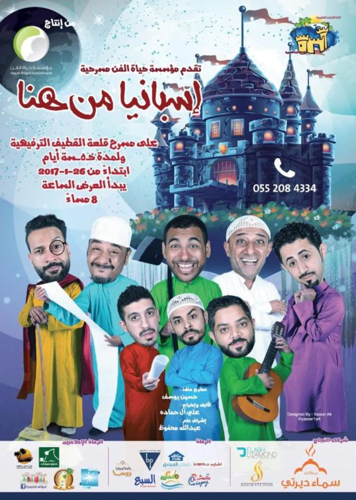 تقام مسرحية «إسبانيا من هنا» على مسرح قلعة القطيف الترفيهية في 26/1/2017م لمدة خمسة أيام، ويبدأ العرض في تمام الساعة 8 مساء يوم الخميس من قبل مؤسسة «حياة الفن» لكل أفراد الأسرة.