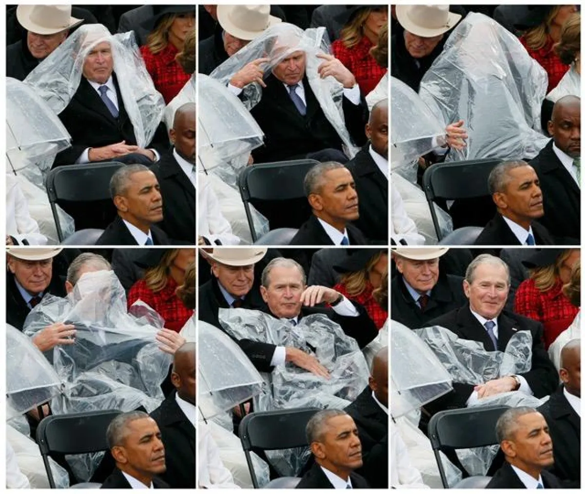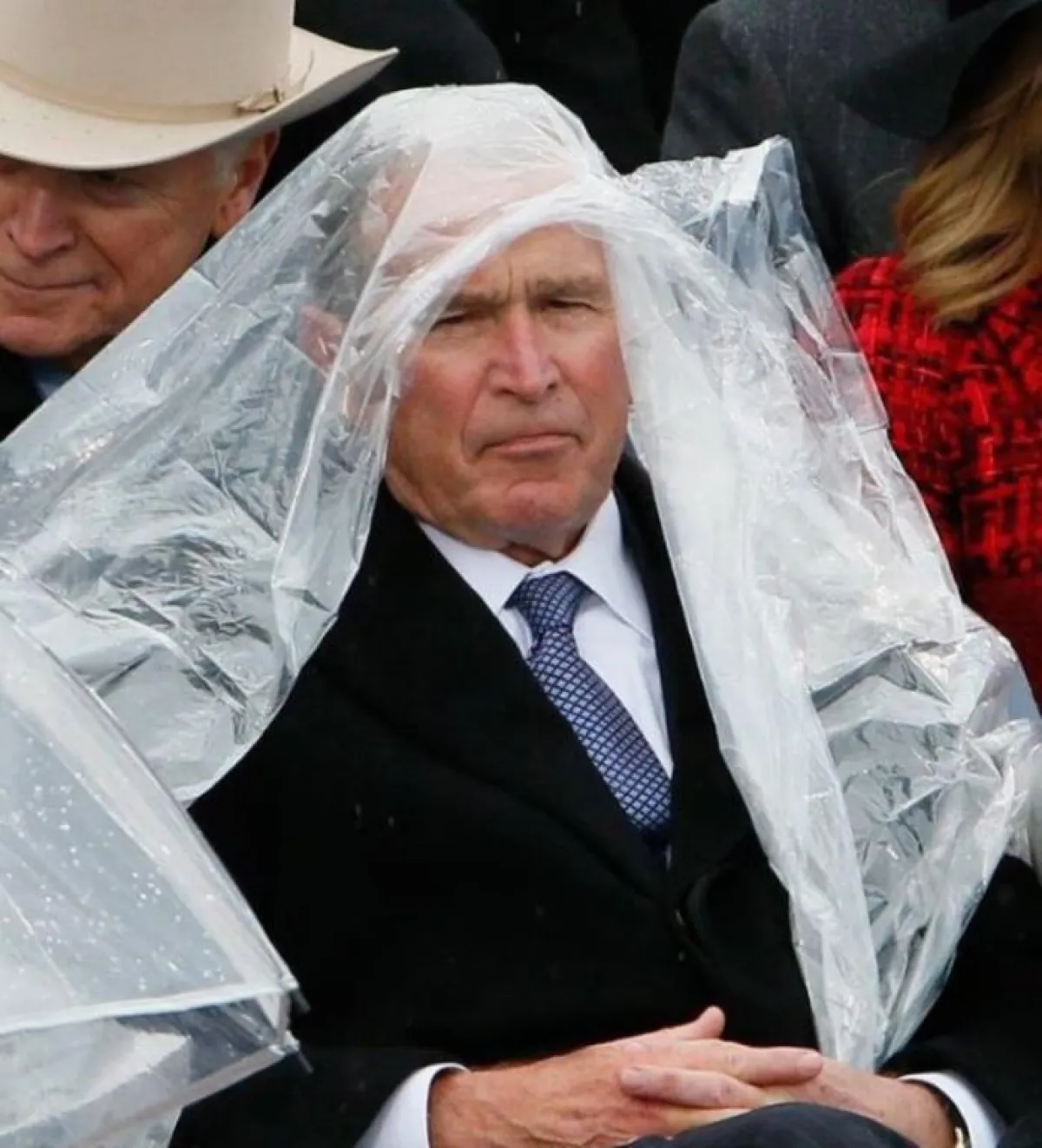 لفت الرئيس الأمريكي الأسبق جورج بوش الإبن الأنظار خلال حفل تنصيب الرئيس المنتخب دونالد ترامب Donald Trump، حيث انتشرت سلسلة من الصور الطريفة له وهو يحاول أن يغطي نفسه بـ كيس بلاستيكي شفاف ليتفادى الأمطار التي هطلت أثناء أداء ترامب لليمين الدستورية.