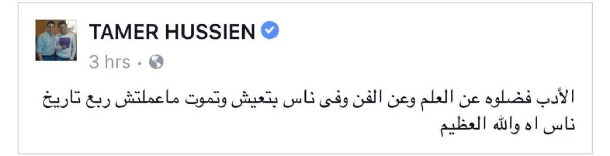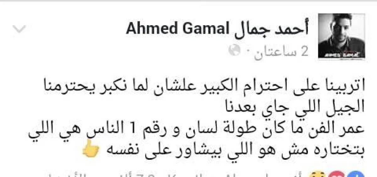 بينما أطلق نجم أراب أيدول أحمد جمال تدوينه اكد فيها انه تعلم احترام الكبير حتى تحترمه الأجيال القادمة وأضاف: اتربينا على احترام الكبير علشان لما نكبر يحترمنا الجيل اللي جاي بعدنا، عمر الفن ما كان طولة لسان و رقم 1 الناس هي اللي بتختاره مش هو اللي بيشاور على نفسه.