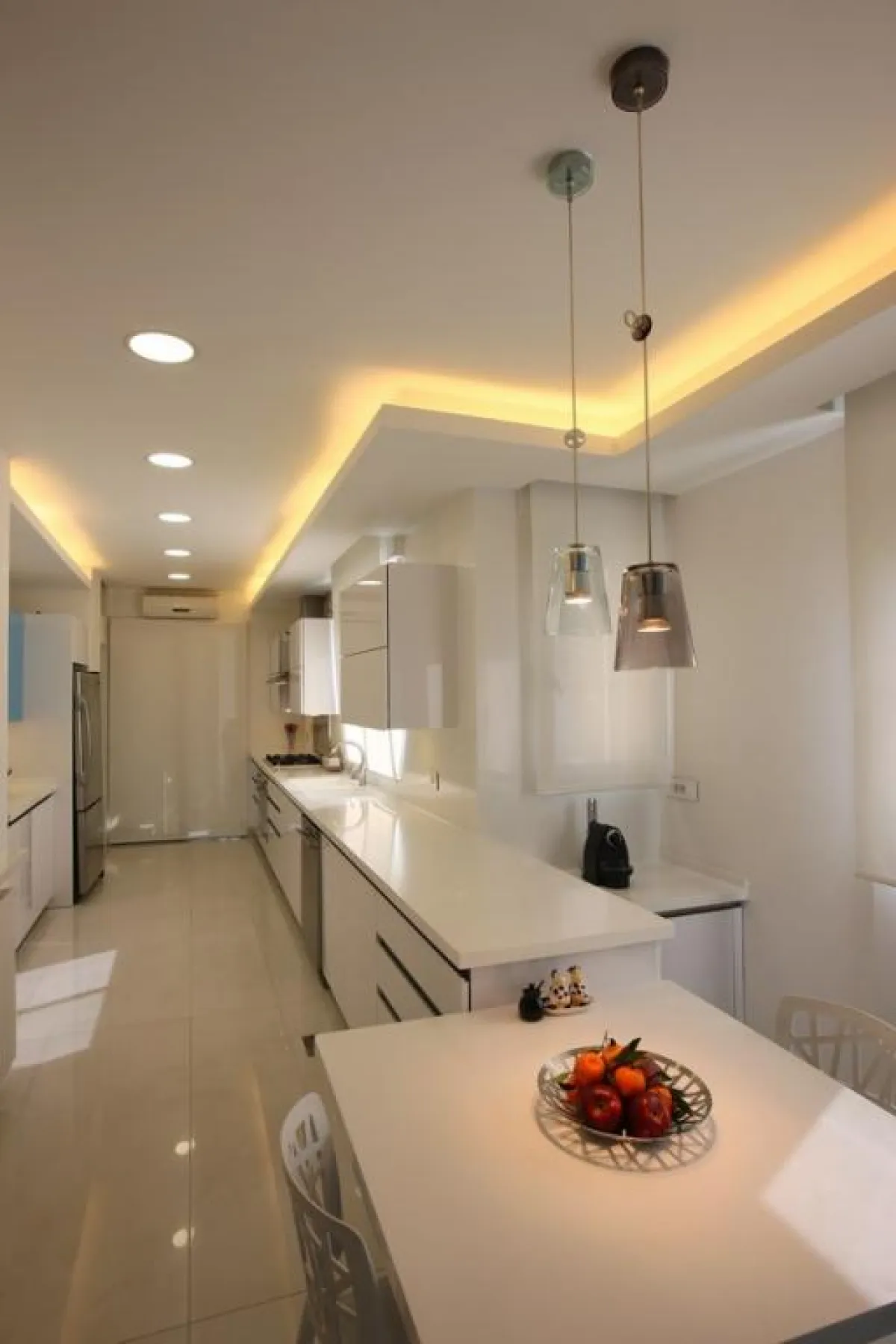| للإنارة دور هام في تصميم المطبخ، فإنّها تُثبّت تحت القطع كافة، بدون الإغفال عن الاستعانة بإنارة السقف المباشرة، وتلك غير المباشرة حسب رغبة المالكة.