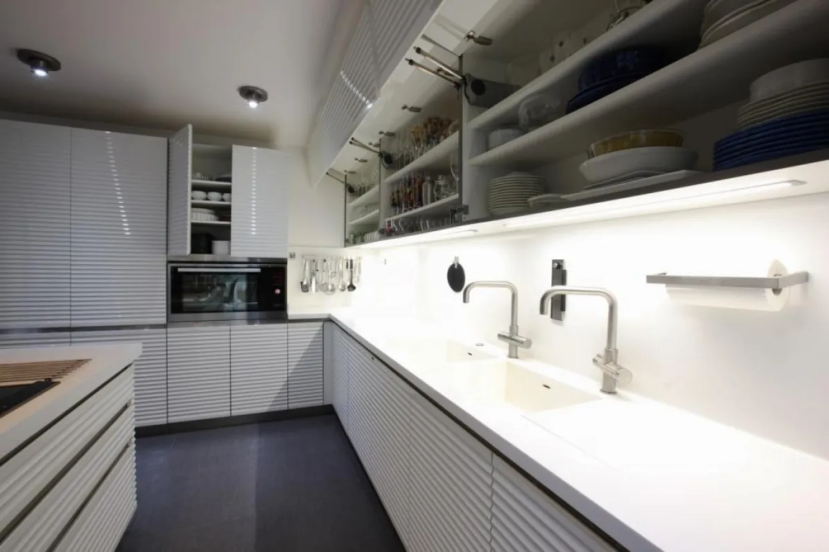 | تُفتح الدرف في المطبخ المتطوّر بشكل أفقي وليس عموديًّا ما يحقّق الأمان، وإمّا هيدروليكيًّا أو كهربائيًّا، وبصمت، وذلك من خلال لمس زر خاص لعملية الإقفال أو الفتح.