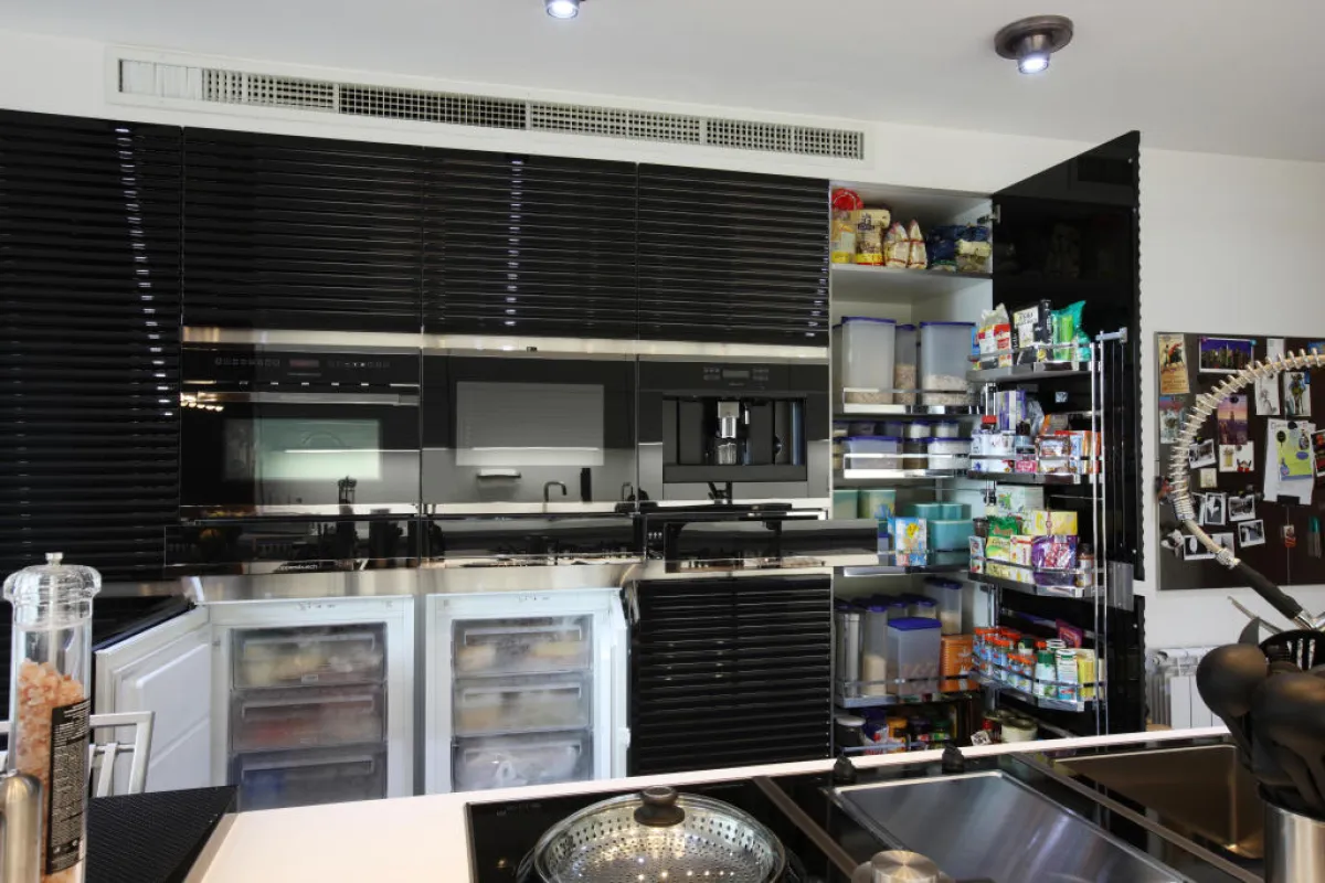 | تتوفّر خزانة كبيرة تُسمّى بالـ"سوبرماركت" في خزانة جانبيّة من المطبخ الحديث.
