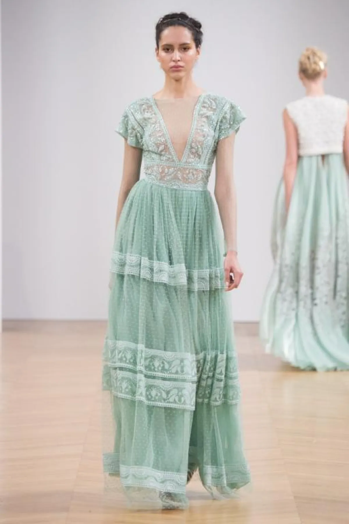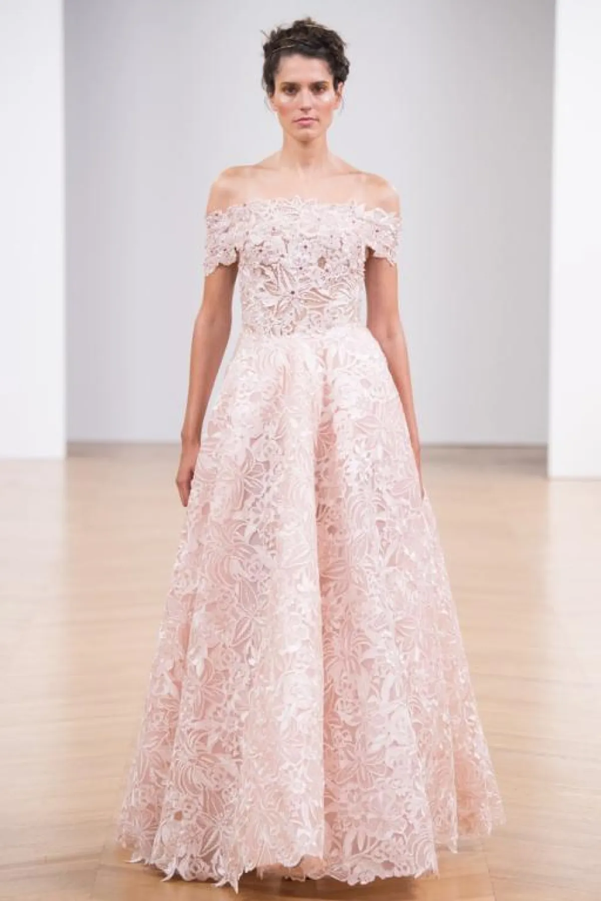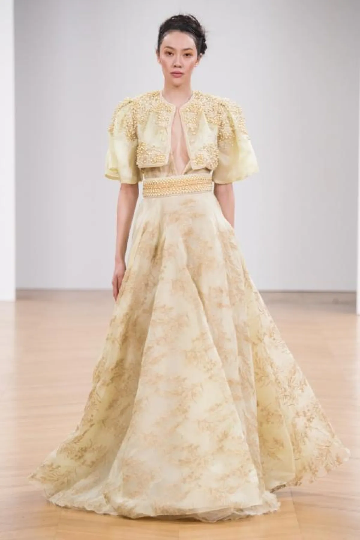 اشراقة الموسم، تنسحب الى "باليت" ألوان الـ"باستيل" الهادئة في المجموعة، فيما يتشكل فستان الزفاف الابيض، من باقة من الازهار منحته طابع رومانسياً.